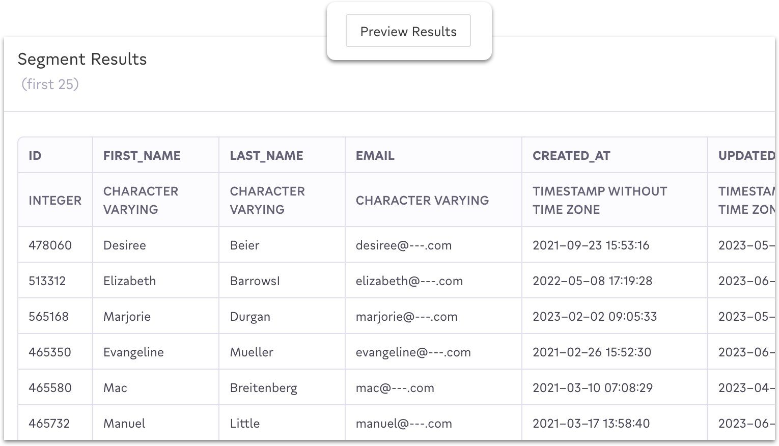At any point, you can also view a sample of the members of a particular segment by pressing the Preview Results button in the top right of the segment view. This will show the first 25 members of your segment as currently defined.
