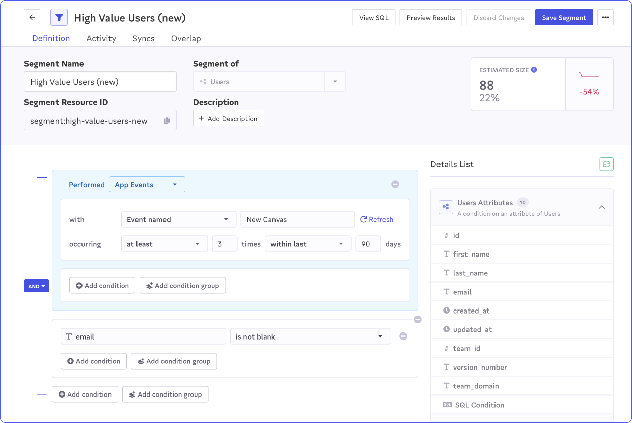 Though Activations' visual segment creator is designed to be used without knowing any SQL, it works by generating SQL underneath the covers and running that against your data. You can actually view this SQL at any point by pressing the View SQL button.