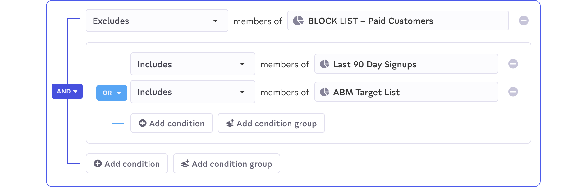 - Inclusions and Exclusions - Allows including or excluding members from a segment if they appear in some other segment of the same dataset data. This enables creating sub segments of common shared definitions like Paid Customers, excluding segments that should never be targeted, as well as creation unions and intersections of of multiple other segments.