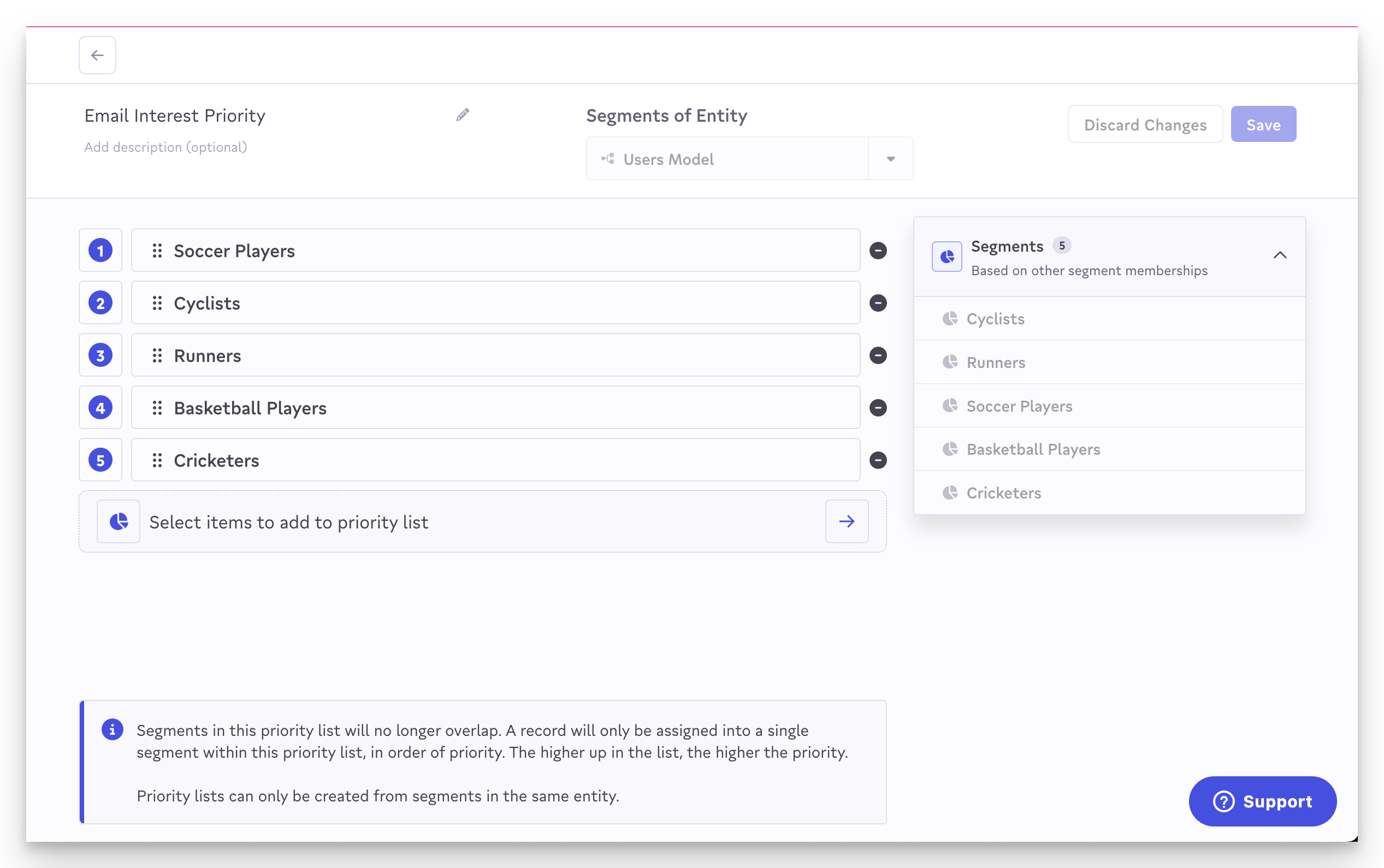 Marketing to a large audience can be a challenging task, especially when you have hundreds of different segments that overlap in different ways. Often, marketing teams want to ensure that users only appear in a single segment at any given time. This is where segment priorities come in.