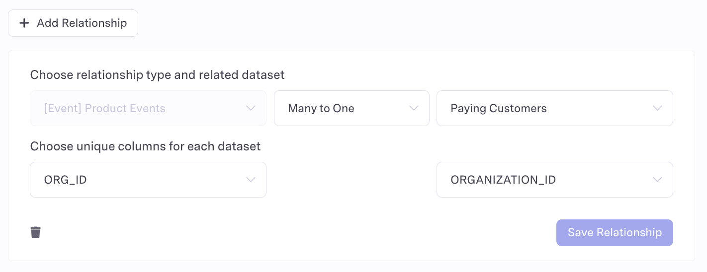 Datasets support the ability to be related to one another. The supported relationships are one-to-one, one-to-many, many-to-one, and many-to-many. Datasets relationships are an optional feature. However, defining relationships between datasets in Activations unlocks advanced functionality across the product.