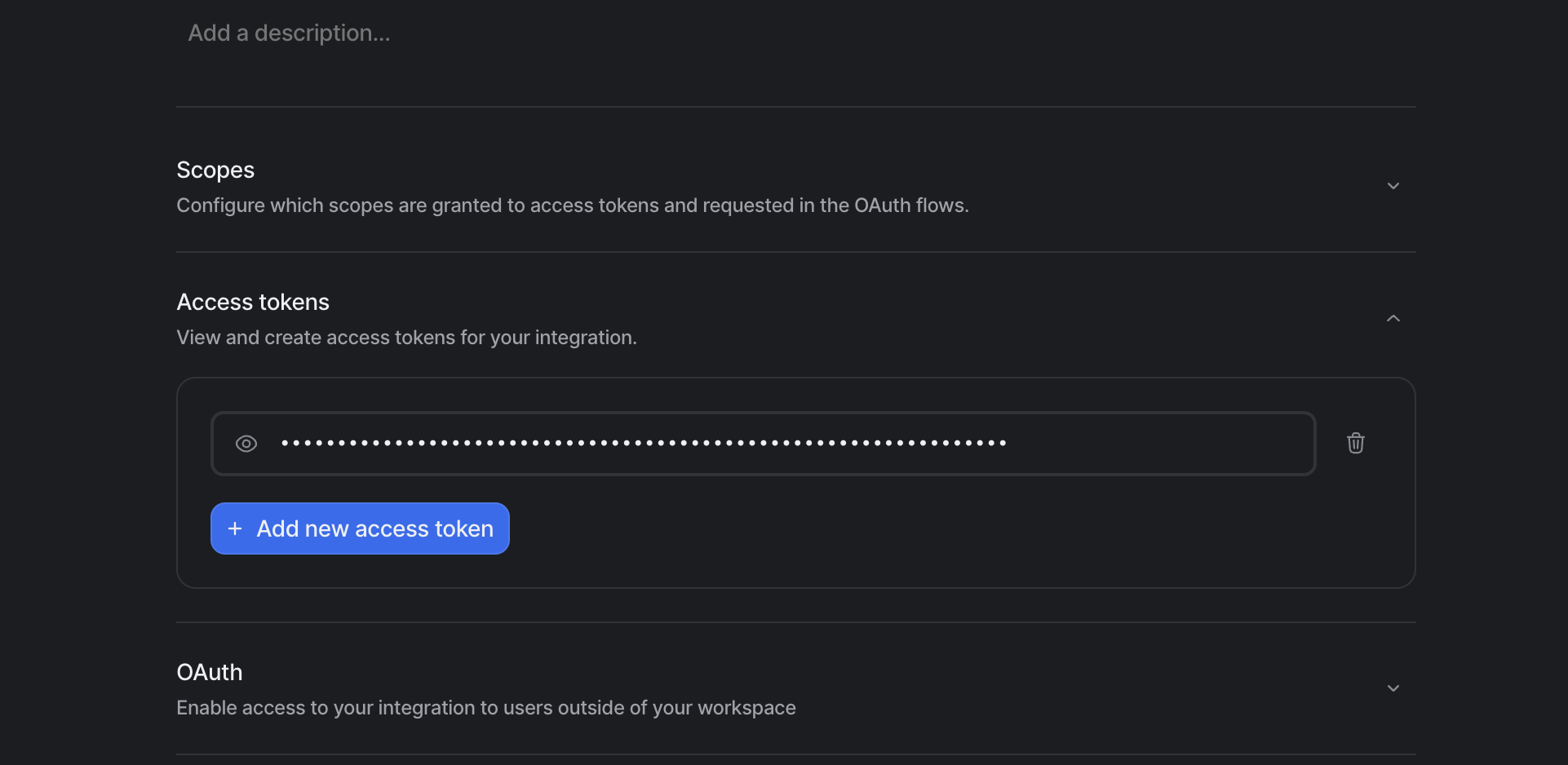 Once the integration is created, a new access token will be available within your new integration. Copy this value.