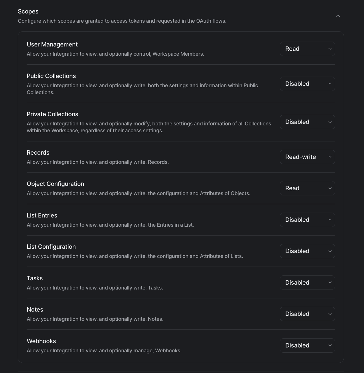 Read/Writeaccess forRecordas well asReadaccess forObject ConfigurationandReadaccess forUser Managementunder theScopessection.