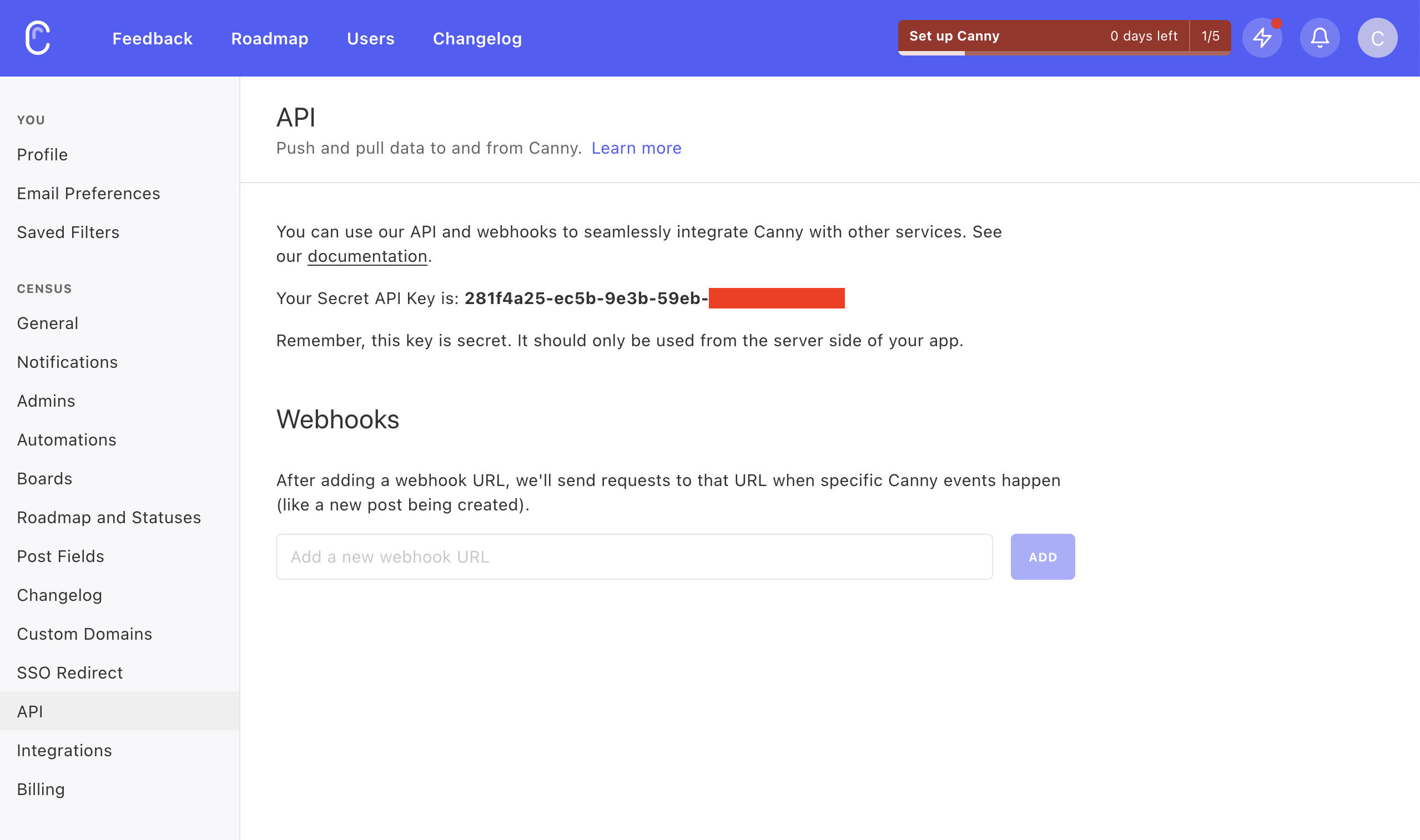 - Enter your API Key, which can be found in the Canny app at Settings > API.