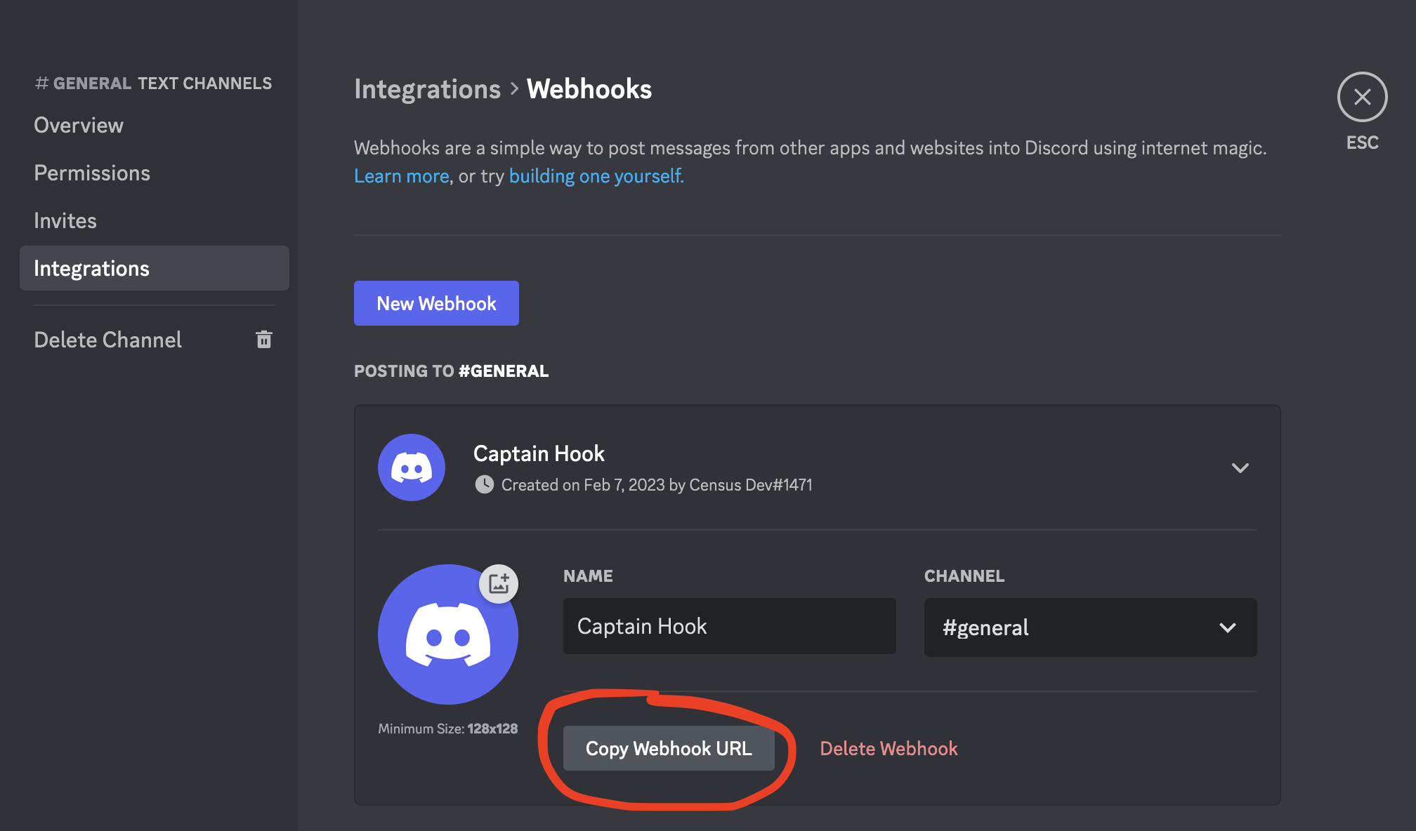 - Open the Discord app in another tab and go to the settings for the channel you'd like to post to. Create a new webhook or view an existing one. Copy the Webhook URL.
