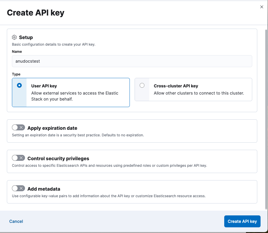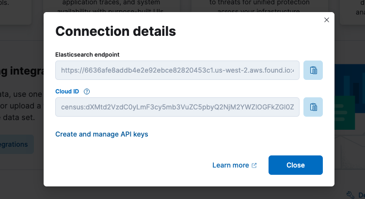 - Cloud ID - this can be found in your Elasticsearch cloud instance by clicking Help -> Connection Details