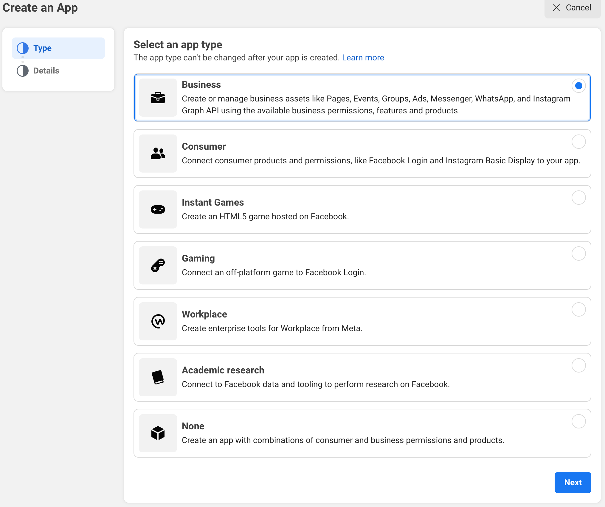 This destination relies on a Facebook System User token for authenticating requests. A regular system user is recommended over an admin system user. You can use an existing system user or create a new one with the following steps: