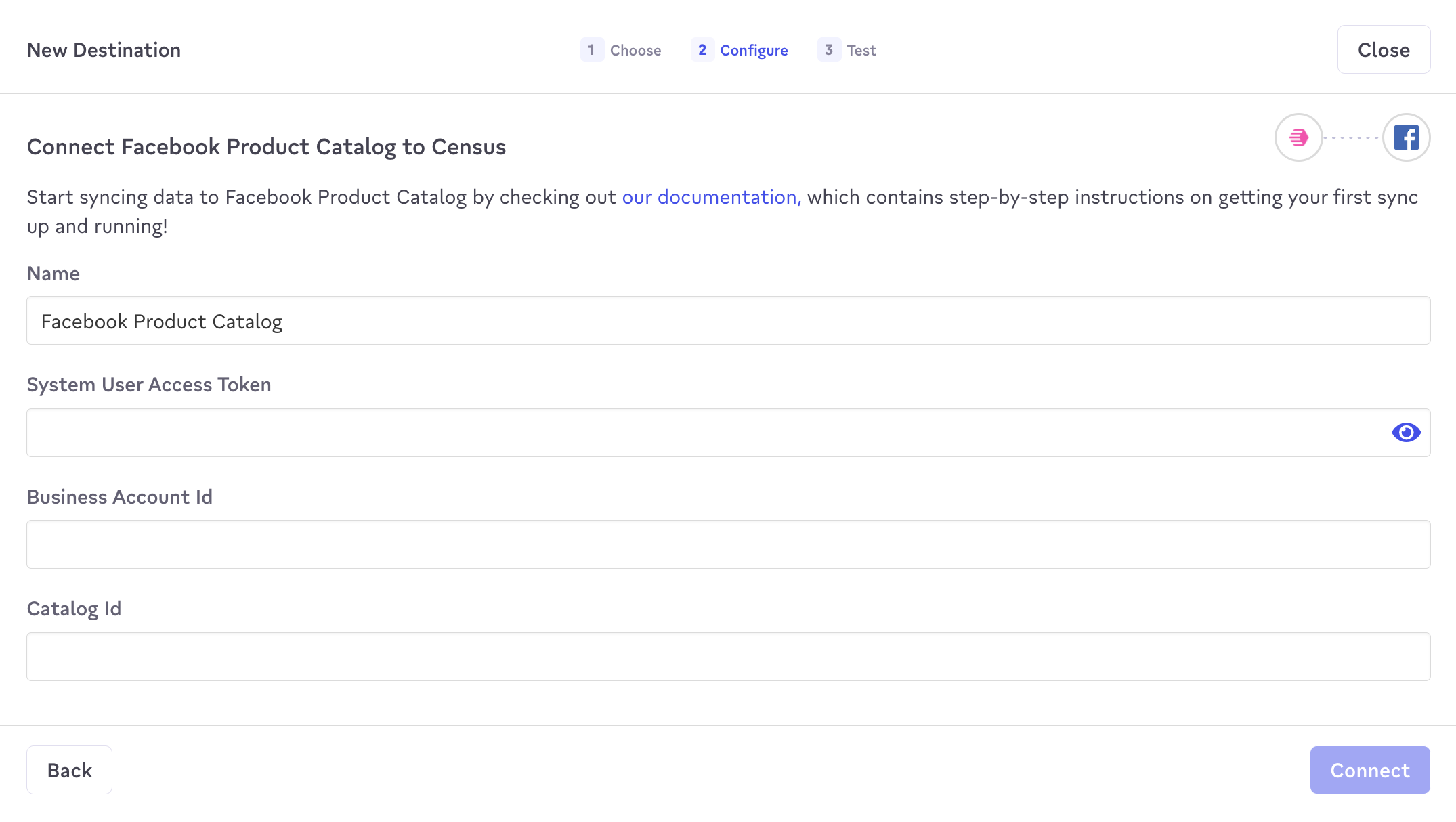 You will need to provide the System User Token you generated earlier along with your Business Account Id and the Catalog Id you want associated with this specific connection. You can find those in your Business Settings in Business Info and Data Sources > Catalogs respectively.