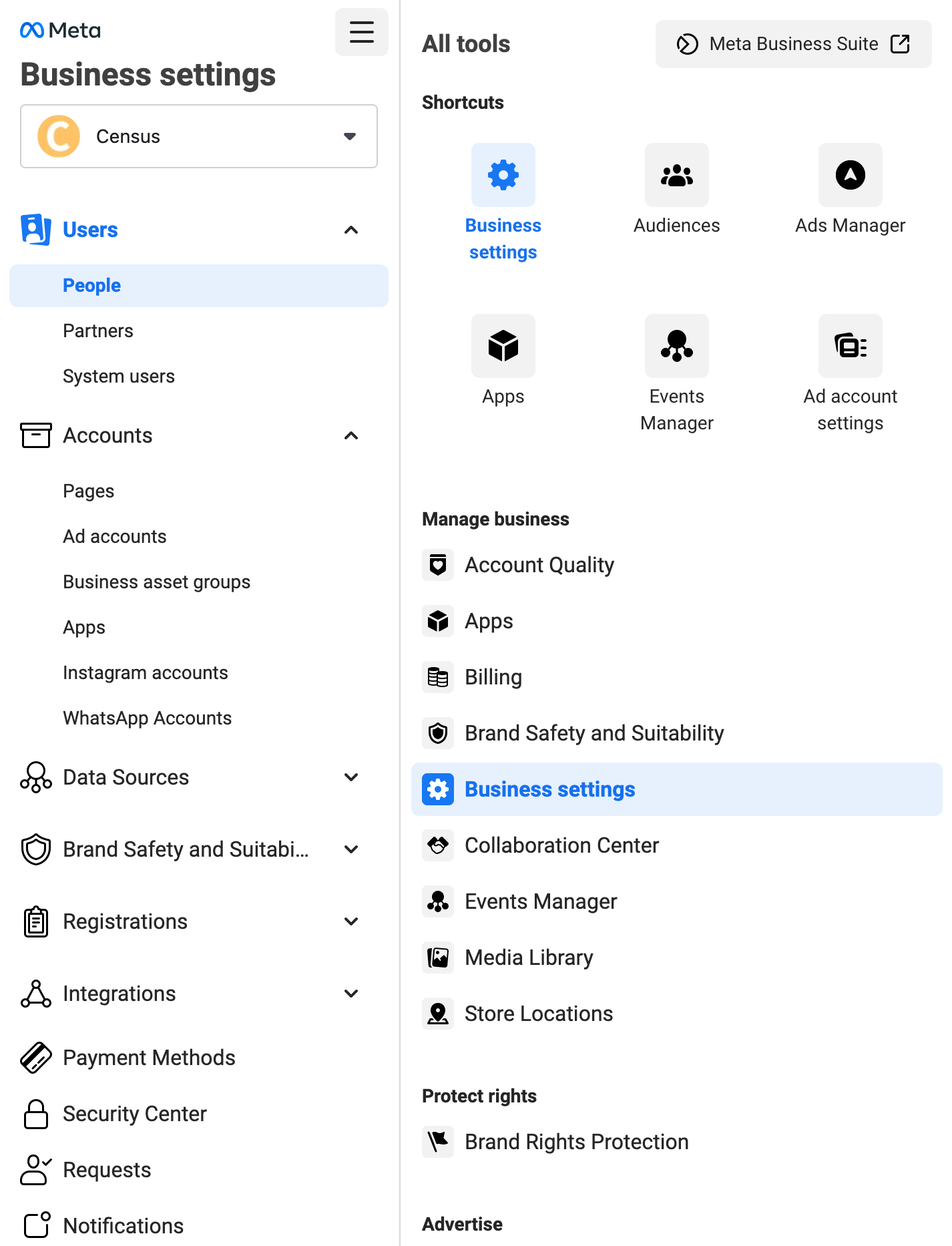 Now you can generate a system user for the app. Go to your Business Manager and navigate to Business Settings > Users > System Users