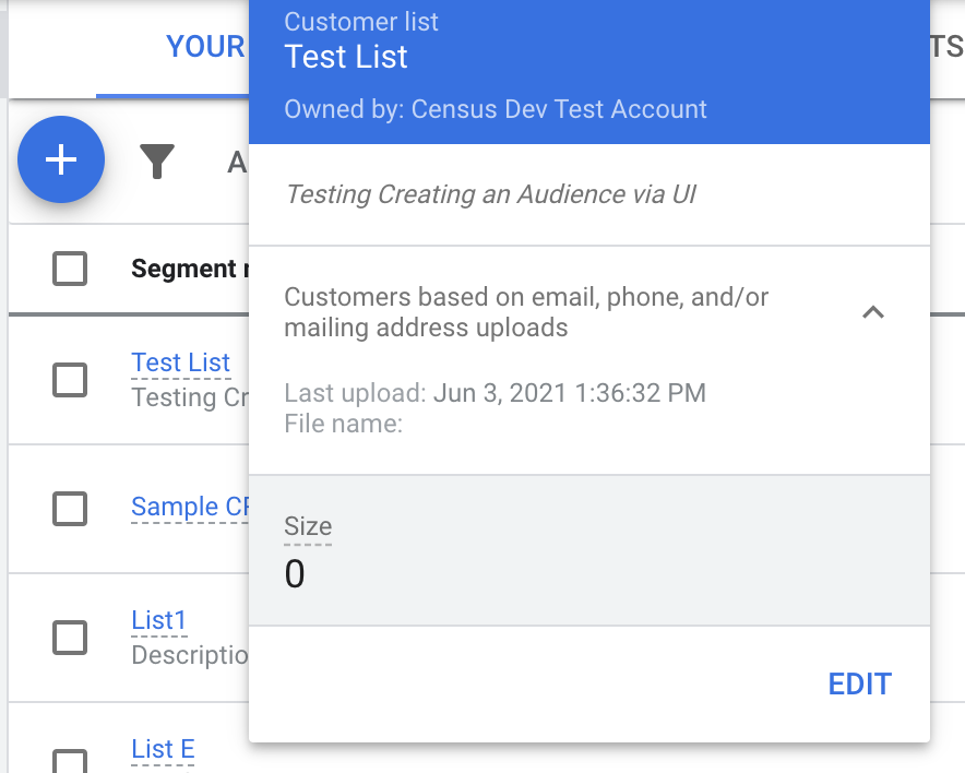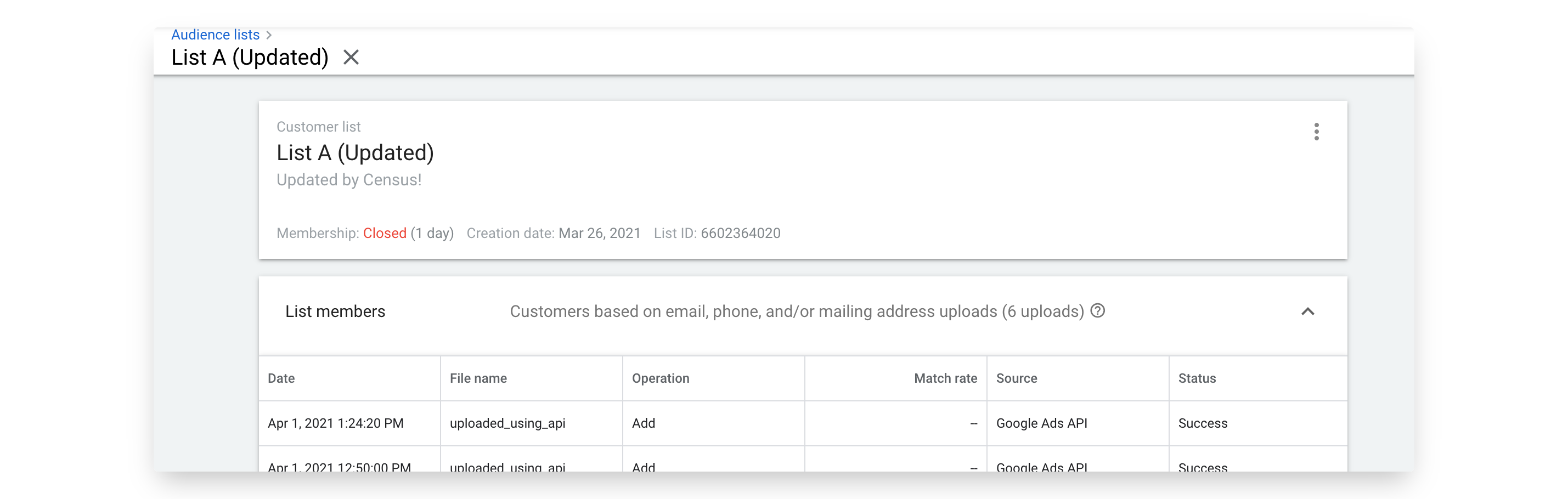 Now go back to your Google Ads account and view the list. If everything went well, you should see that the list has been updated with your data. Because this is an Audience Matching mechanism, Google will not tell you the exact number of matches it found, but should tell you that it was updated.