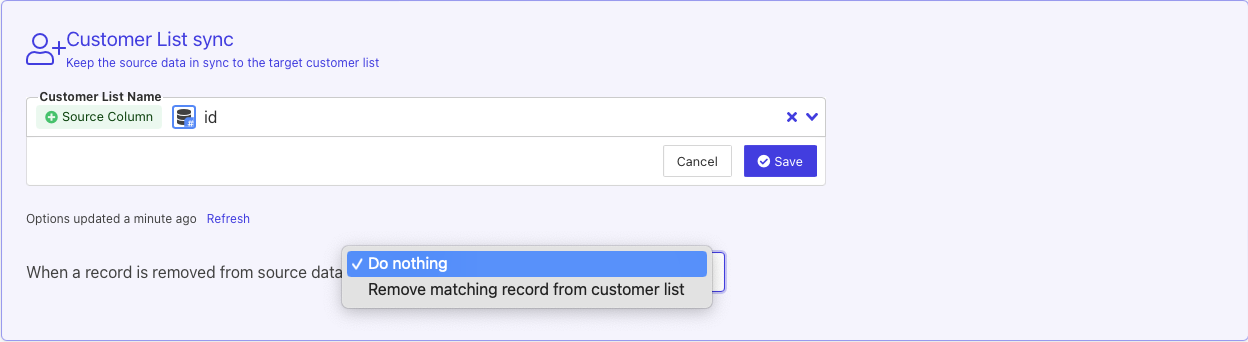 Please note that the above behaviors will map to what you select in the, "When a record is removed from source data" dropdown in the Customer List sync section. Selecting "Do Nothing" will map to Update or Create(Upsert) while "Remove matching record from customer list" will map to Mirror.