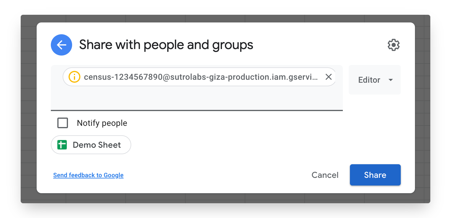 To give Activations access to your Google Sheet, press the Share button and then add paste the Google Identity email from Activations into the share dialog and confirm.