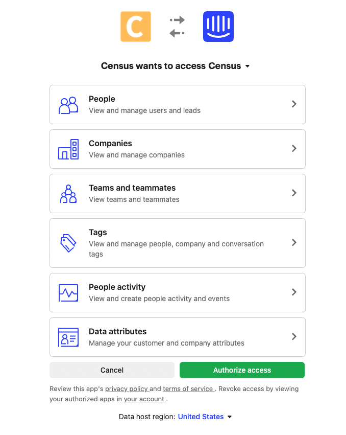 View the permissions needed, select the correct Intercom workspace, and specify the data host region