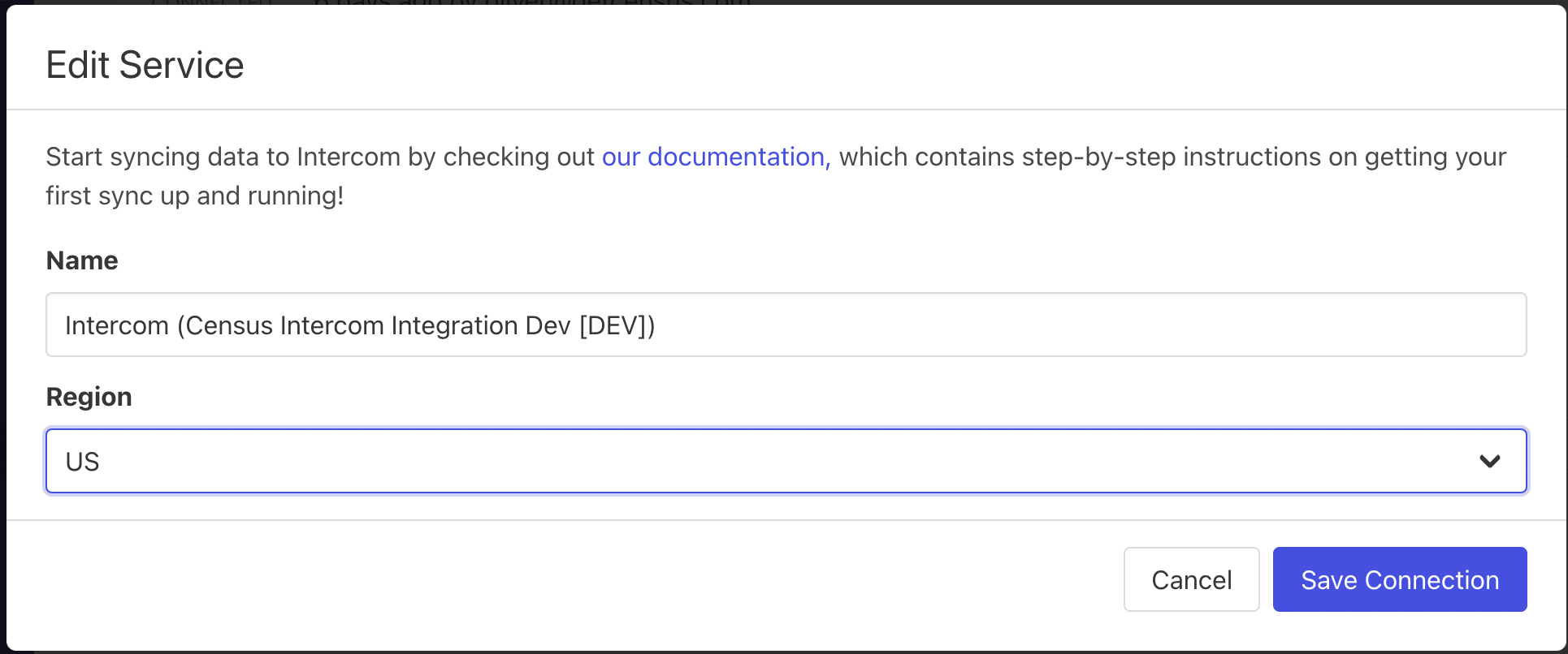Once the connection is created, make sure that the region Activations uses is the same as your Data host region in Intercom. To do this select edit on your connection and then manually select your region from the dropdown.