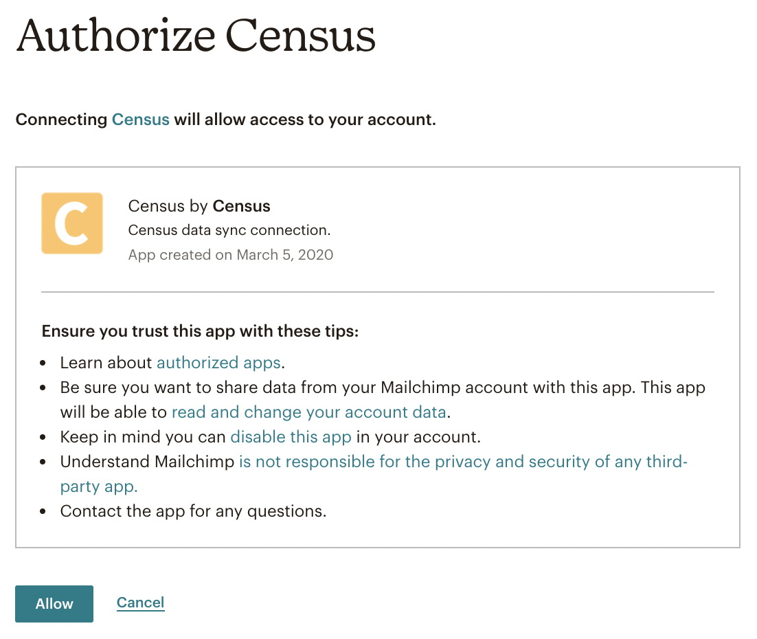 You will be redirected to a page to log in to Mailchimp to authorize your account to Activations. Once you enter your credentials and click the Log In button, you'll see a page like the image below, confirming you want to authorize Activations.