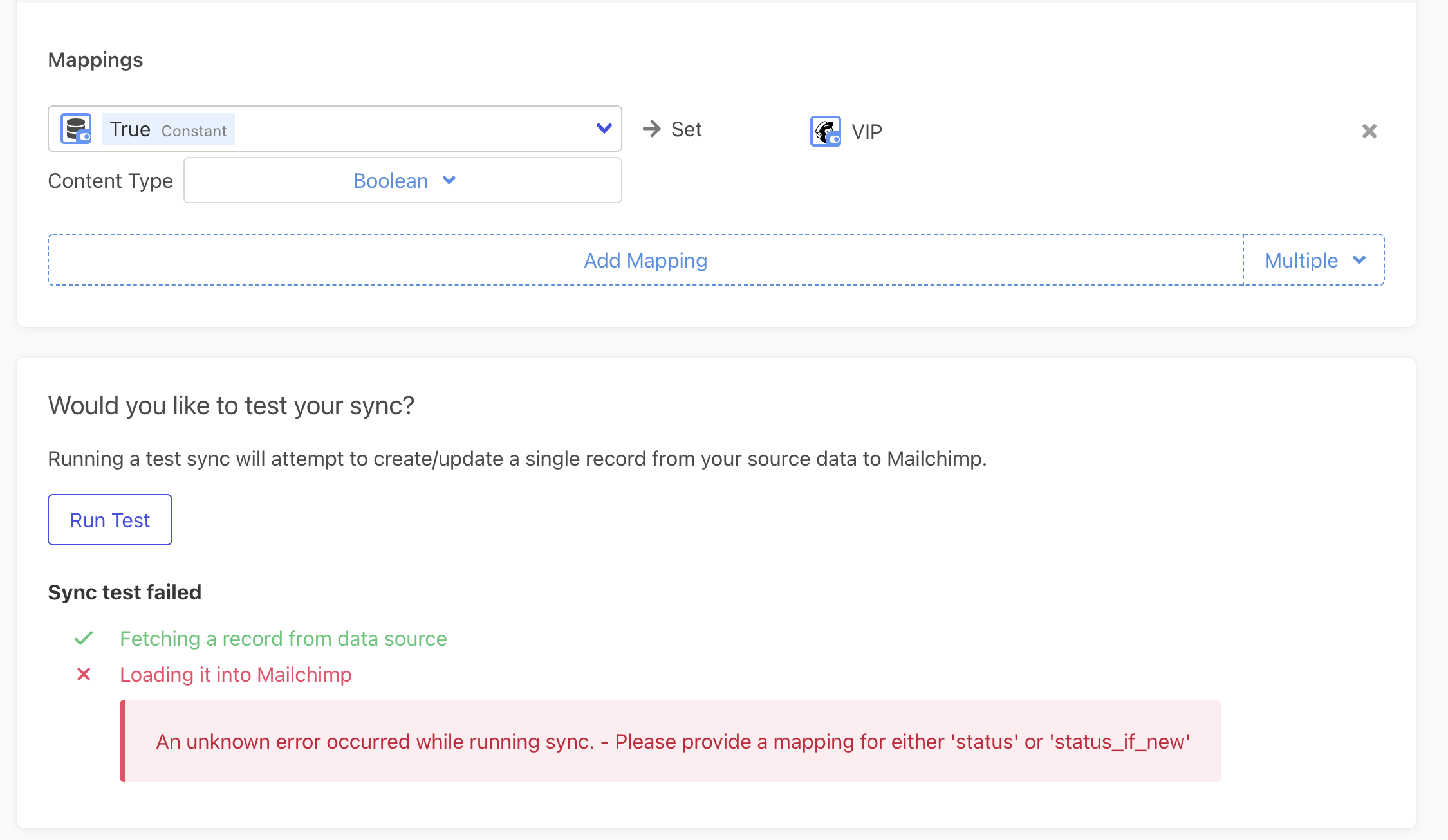 But you don't want to overwrite existing Statuses in Mailchimp, you just need to provide a mapping to the field labeled, "Status For New Subscriber".