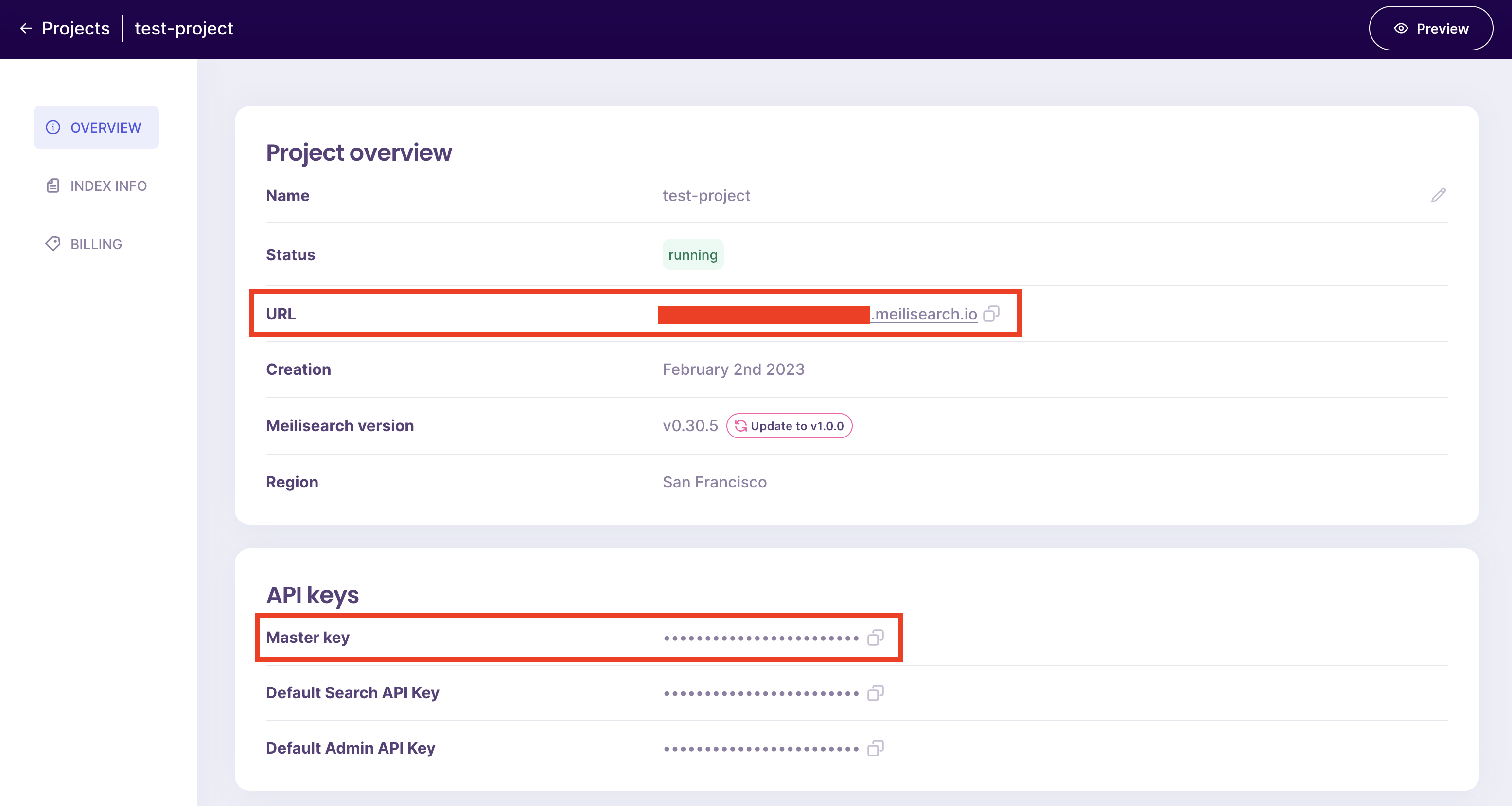 - Enter your Meilisearch Instance URL and Master Key. These can be found in the Meilisearch app by navigating to the relevant project overview page.