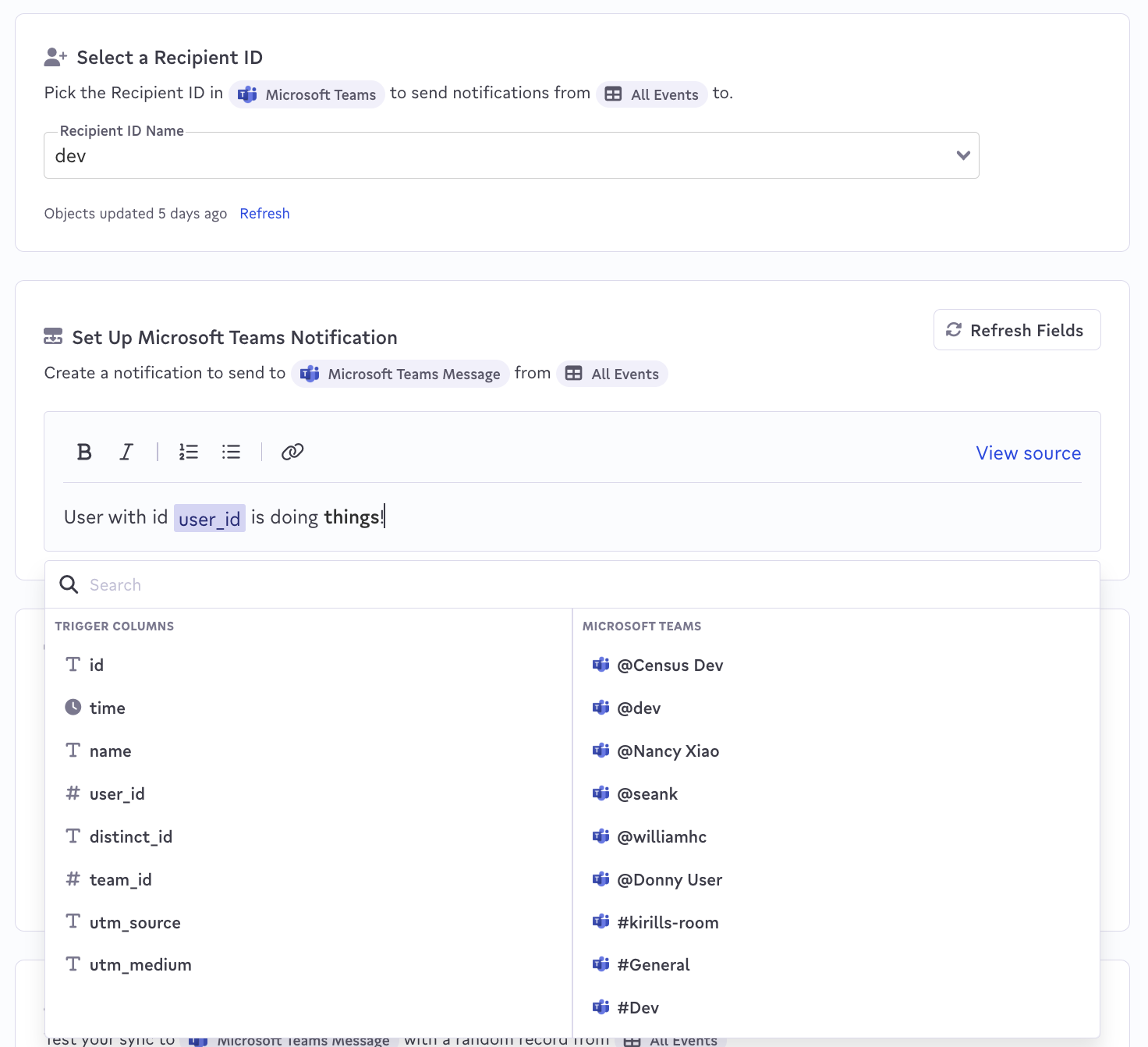 - To embed values from the trigger columns or to mention users or channels from your Teams account, use the dropdown that will appear. If the list is long, try the search function.