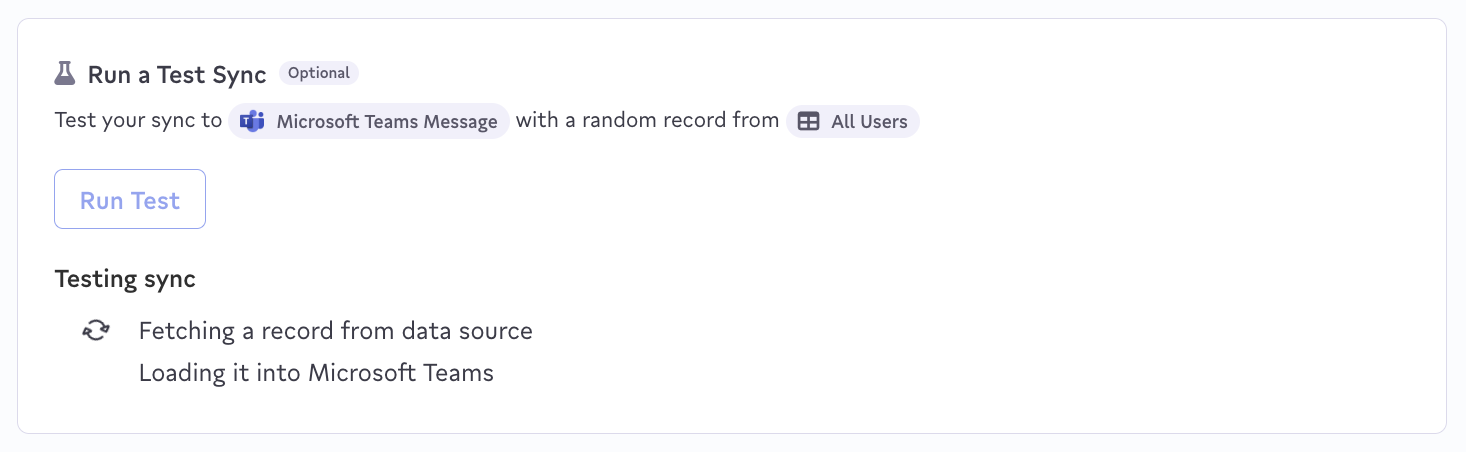 - Click the Run Test button to see a single random record sent to your destination. For testing, you may want to temporarily change the destination message yourself.