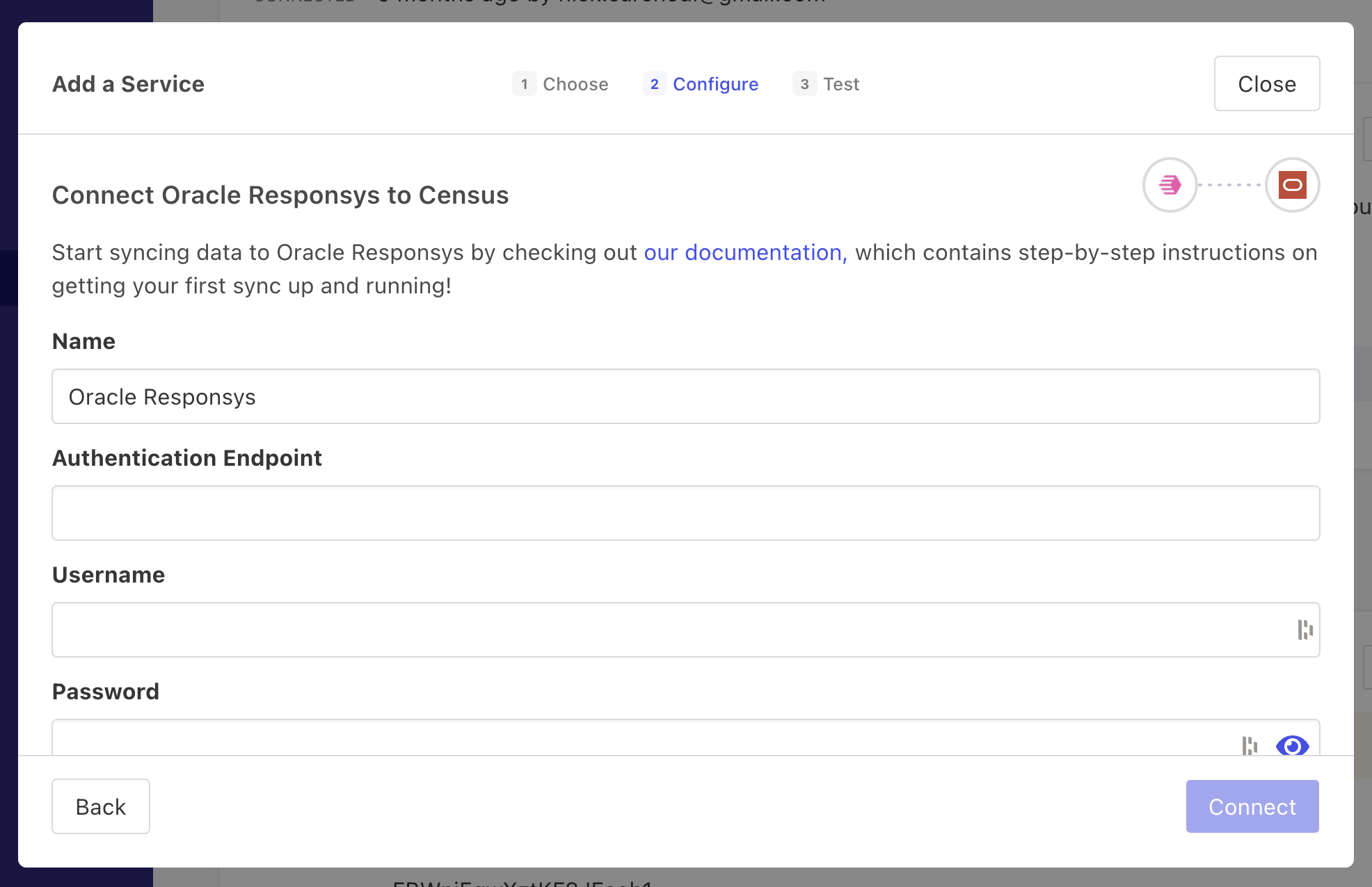 - Enter your Authentication Endpoint (see this page), Username, and Password. Please ensure your Responsys username has API access.