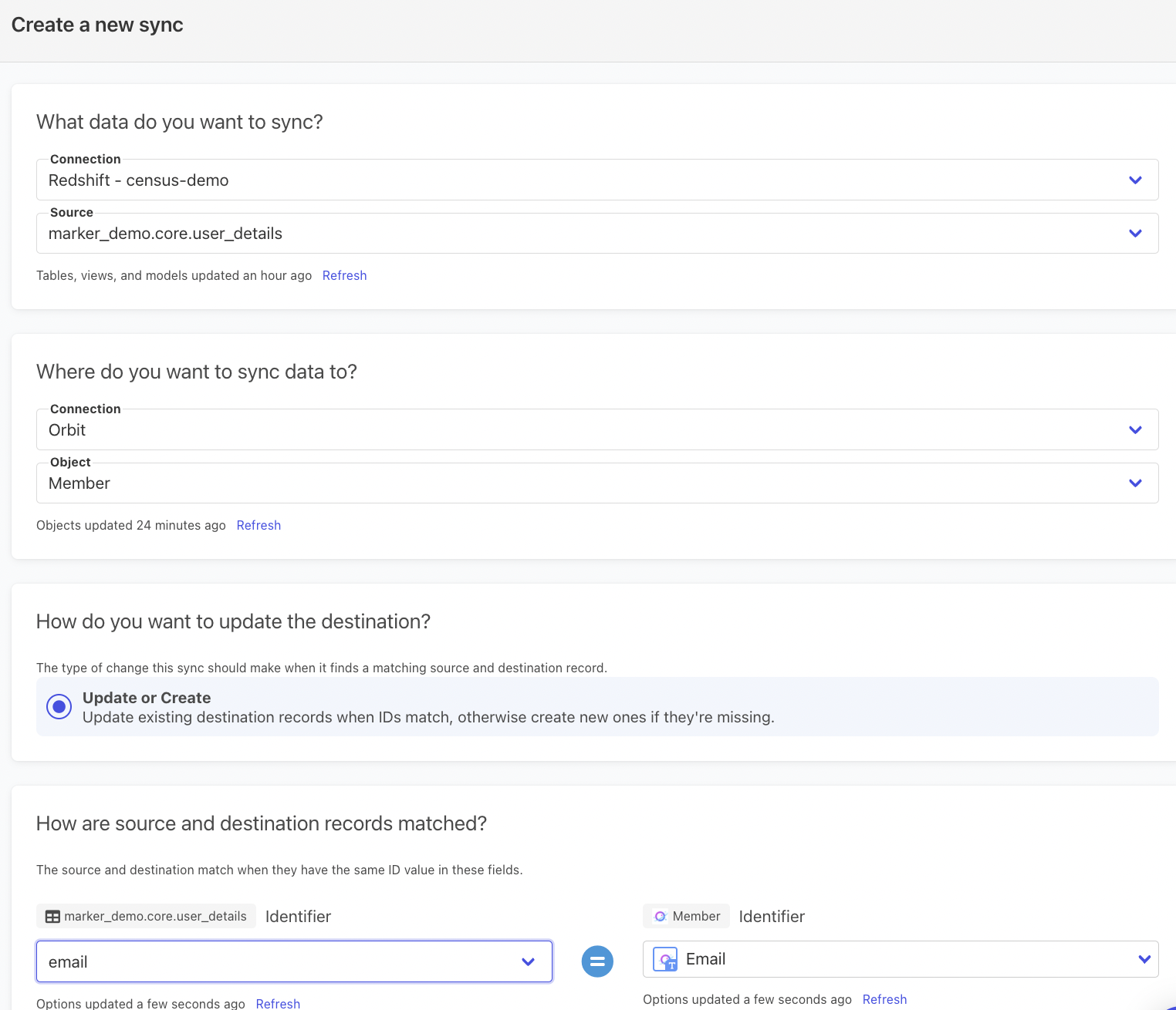 The sync will move data from your warehouse to Orbit. In this step, you'll define how that will work.