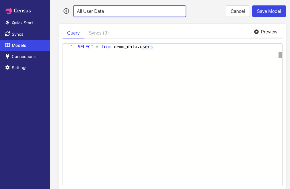 When defining models, you'll write SQL queries to select the data you want to see in Orbit. This can be as simple as selecting everything in a specific database table or as complex as creating new calculated values.