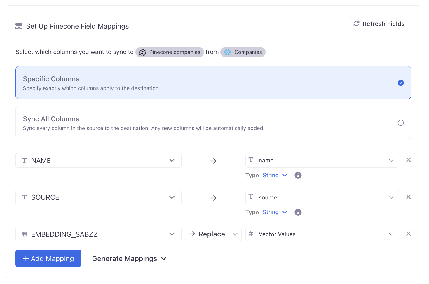 Pinecone supports generating vector values for your data, or bringing your own vectors via external embedding models. Activations supports enriching your dataset with vector embeddings via Embedding Columns. Use an embedding model to generate vector embeddings for your dataset, then sync your Embedding Column to the Pincone Index Vector Values field.