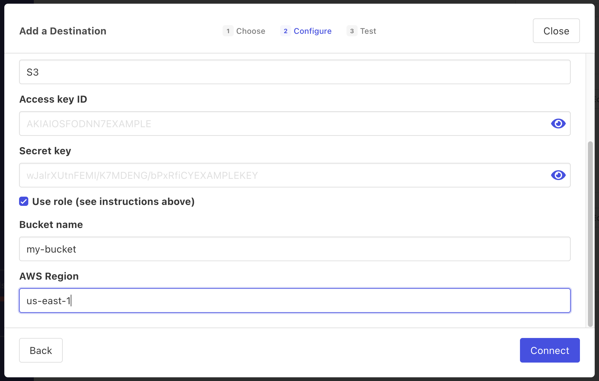 Step 1: When configuring the S3 destination click the "Use role" checkbox. Provide your bucket and region, but leave access and secret key blank. Click Connect: