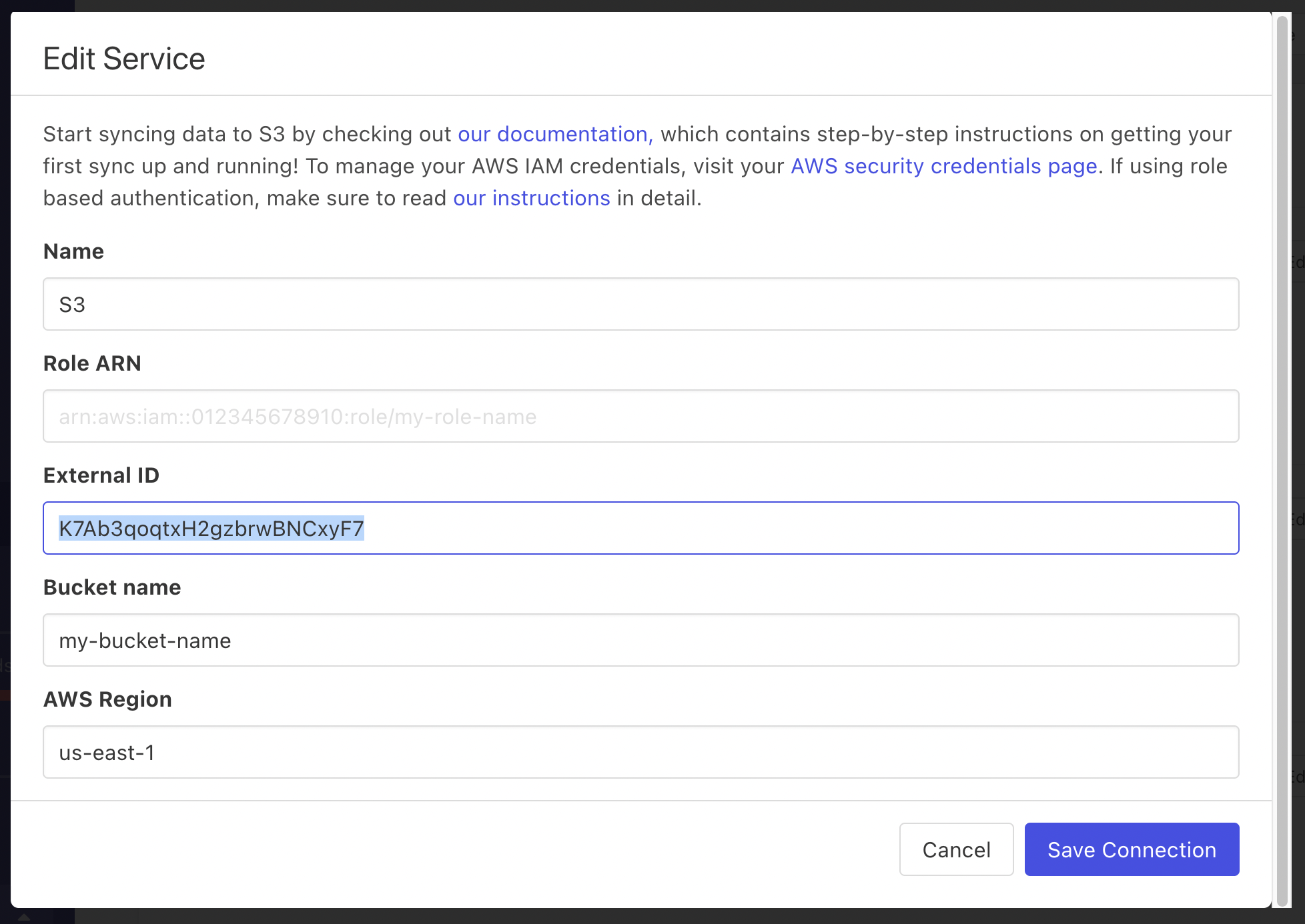 - Enter authentication details for your AWS account and S3 bucket: Access Key ID, Secret Key, Bucket Name, and AWS Region. Activations uses these details to authenticate – they must match your AWS setup. If you would like to use role based permissions instead, see the instructions below.