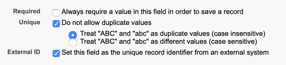 This is the most reliable choice for identifiers on Salesforce objects, particularly for an Update or Create sync. This will ensure no records with duplicate IDs can be created. If you've already got a field like this, you can skip over the setup instructions, but take a look at the advice on reusing existing external ID fields below.