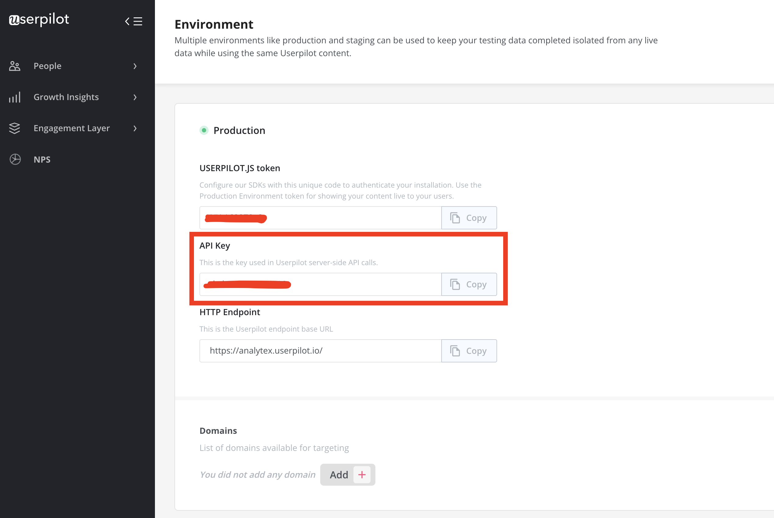 Copy your API key from the Userpilot app.