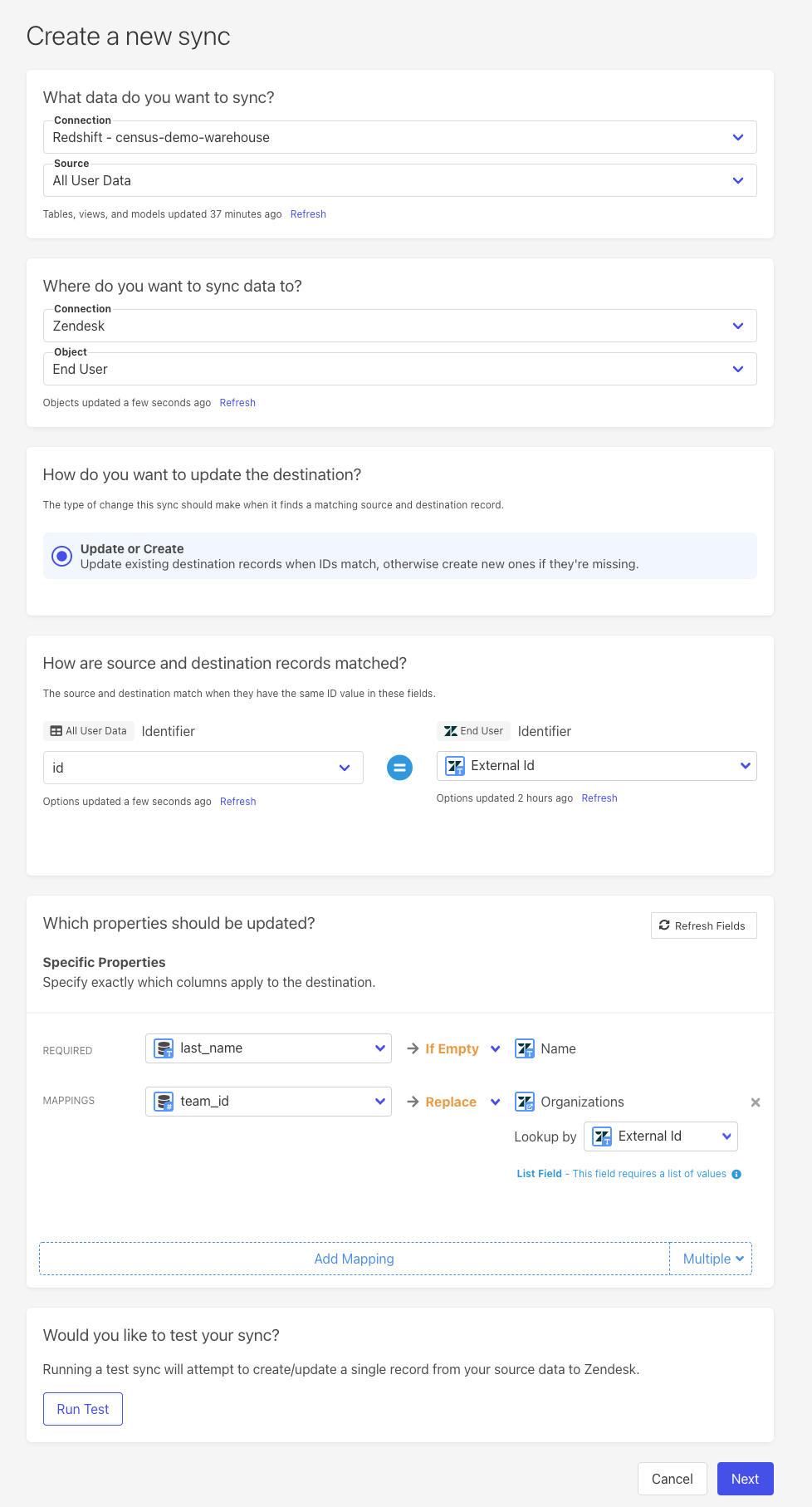 The sync will move data from your warehouse to Zendesk. In this step, you'll define how that will work.