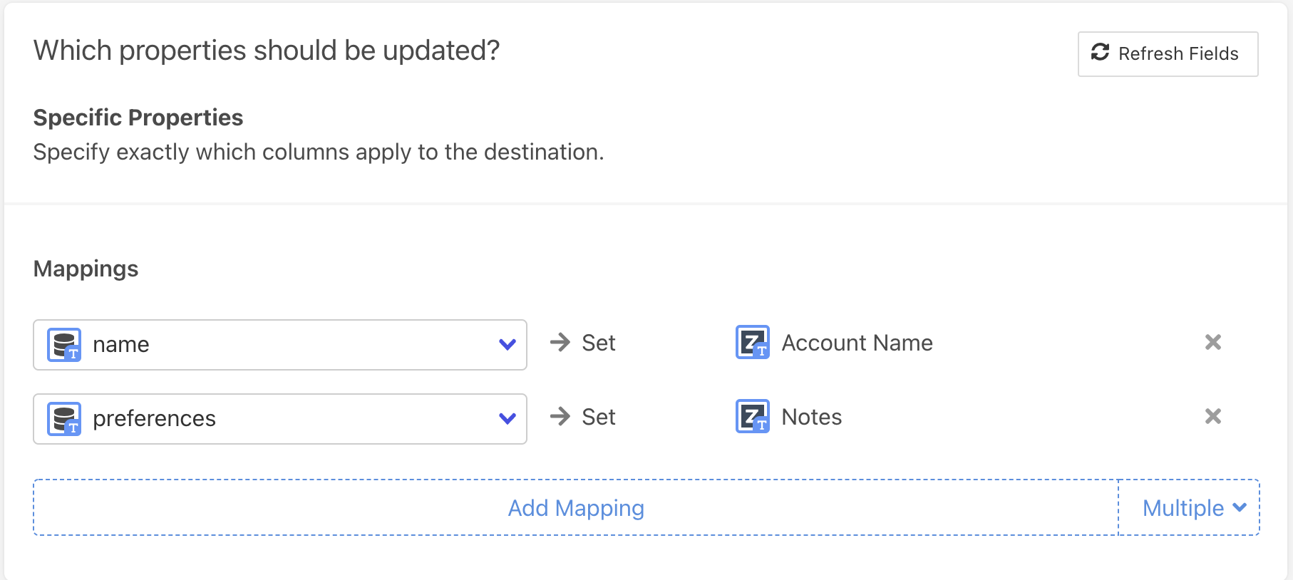 Finally, select the fields you want to update in the Mapper in the "Which Fields should be updated?" section. Here simply map the field from your Zuora instance to the column from your model.