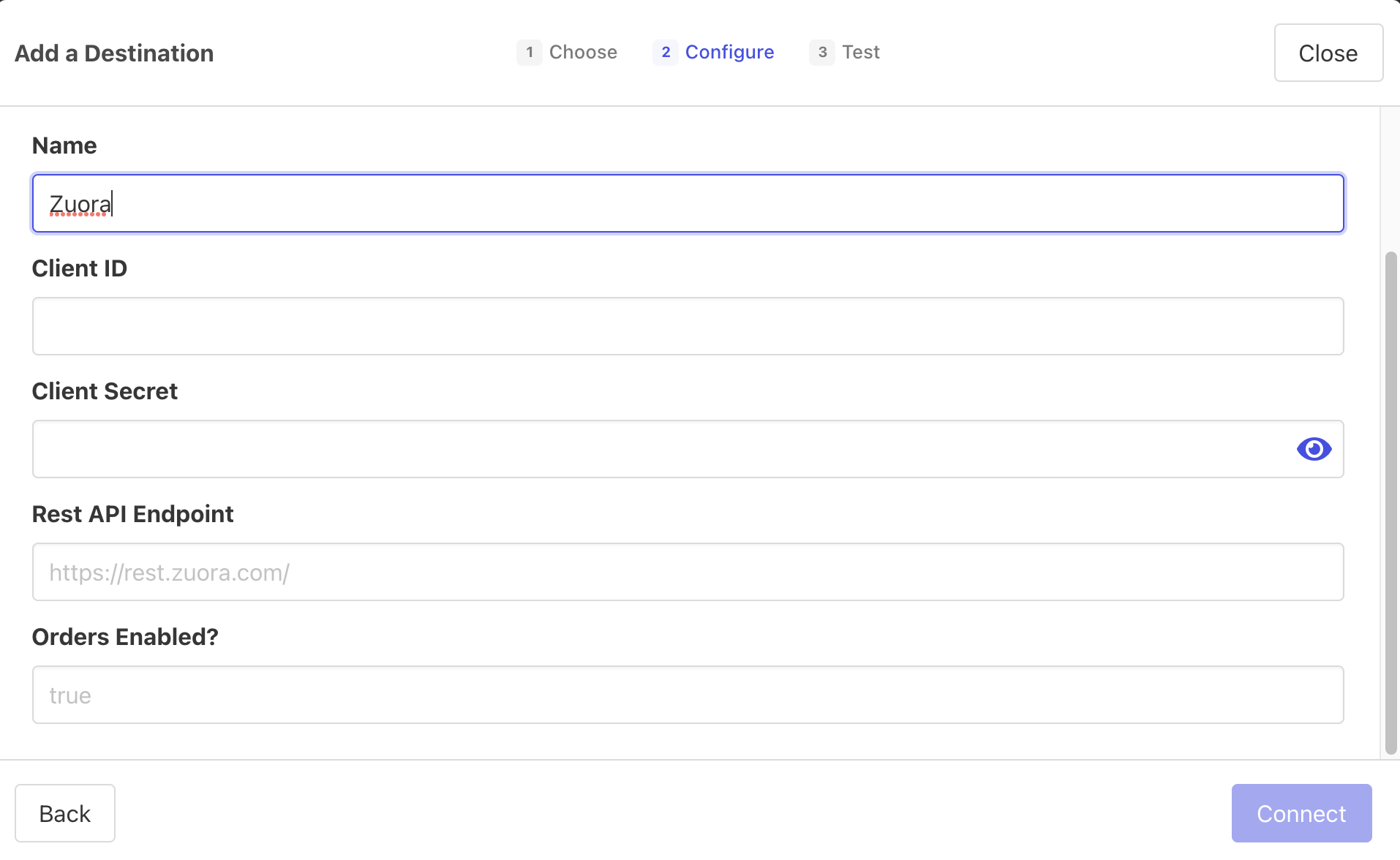 - Provide your credentials collected from Zuora in Step 1.