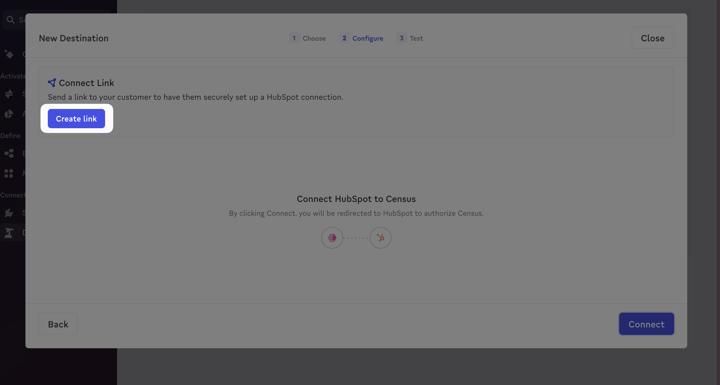From the destinations page in the Activations UI, select "Add a Destination", search for the destination type your customer is hoping to connect, and select "Next". Generate the Connect Link URL with the "Create link" button.
