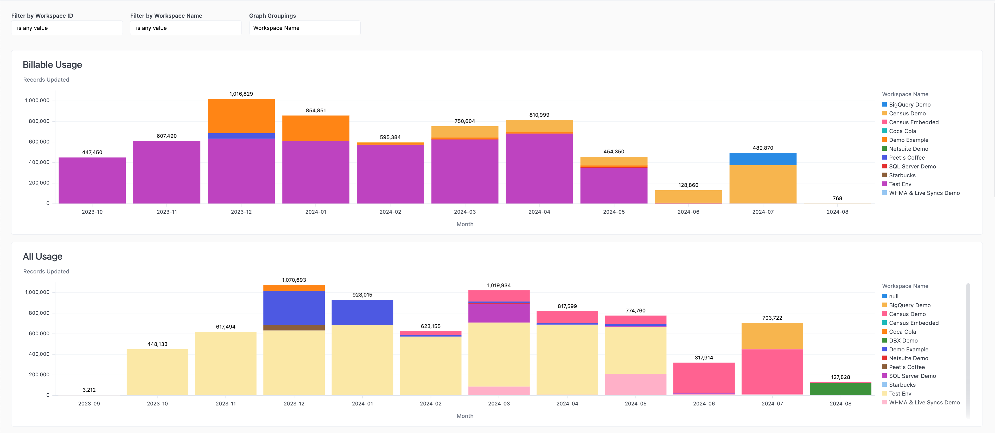 - Filter the entire dashboard by one Workspace Name to see the usage of a single customer.