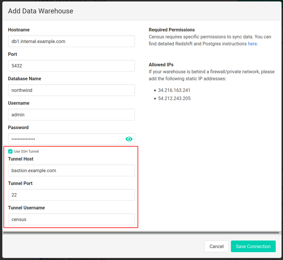 Activations optionally allows connecting to PostgreSQL warehouses that are only accessible on private/internal networks via SSH tunneling. To do so, you'll need to provide an SSH host server that is visible on the public internet and can connect to the private warehouse, and you'll also need to be able to perform some basic admin actions on that server.