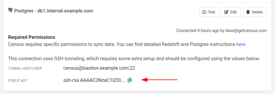 To install the keypair, copy the public key in Activations to your clipboard and add it to the SSH authorized keys file on the SSH host for the user created in the first step. If, for example, this user is named census, the file should be located at/home/census/.ssh/authorized_keys. You may need to create this file if it doesn't exist.