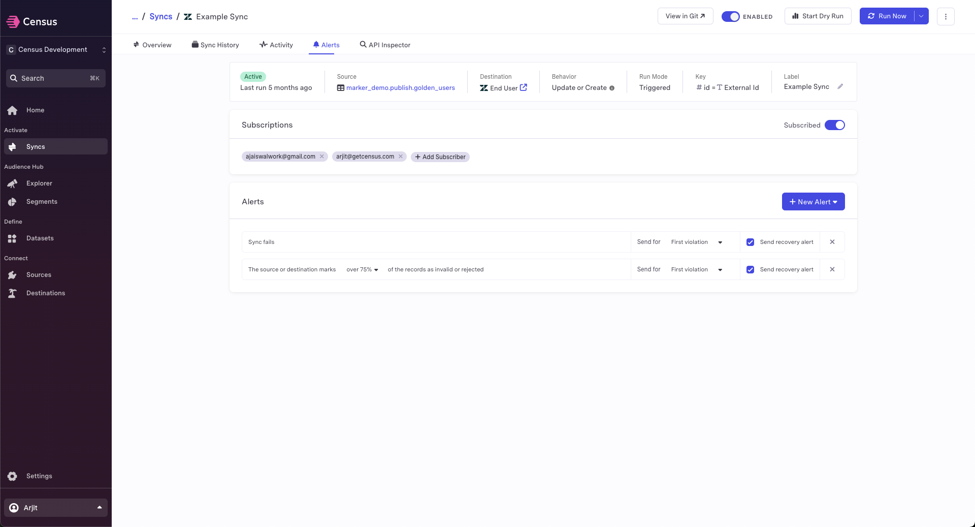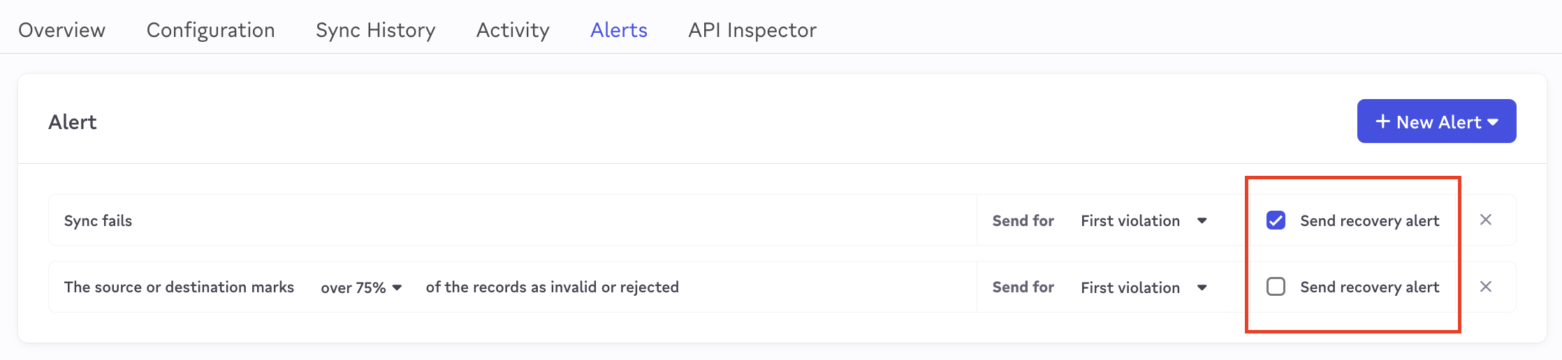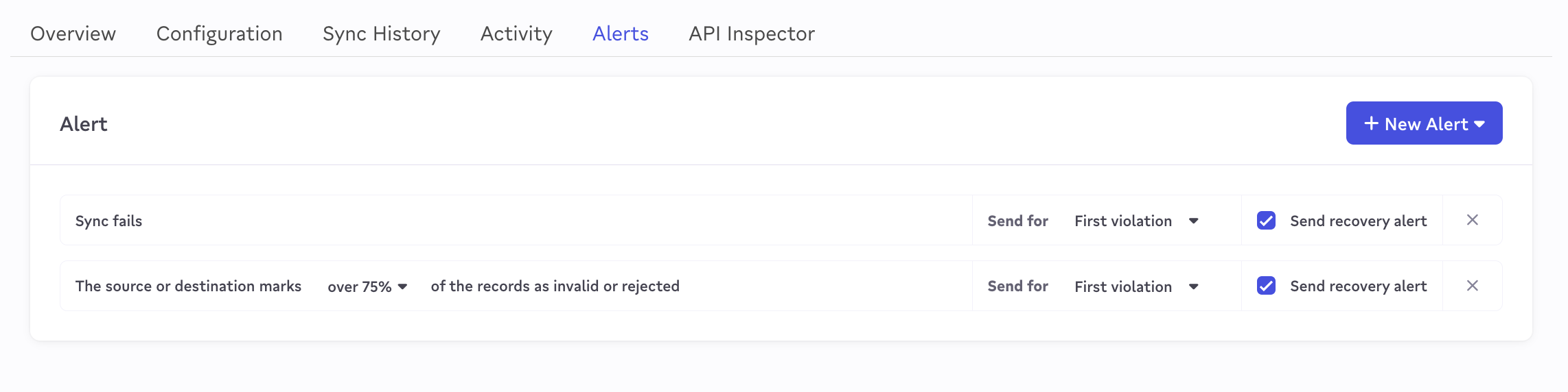 To configure, visit the Alerts tab in your Sync to configure which alerts are enabled per sync. By default, you will have 2 alert types enabled.