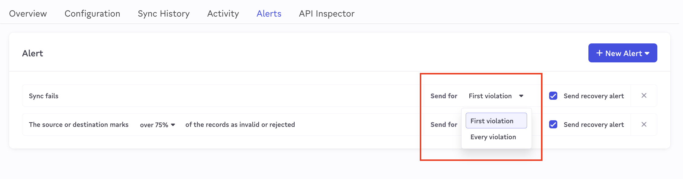 - First Violation (default) - You will be alerted the first time an alert condition is violated, but not on each consecutive failure. If your alert resolves and then re-opens, you will still get alerted for the new violation.