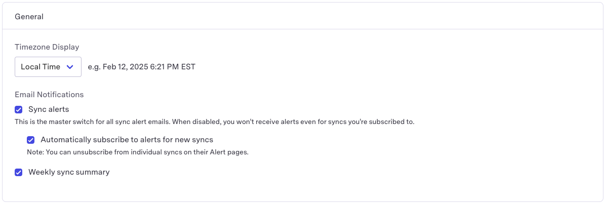 The 2 primary alert types are Sync Alerts and Weekly Summary Email. For the Sync Alert type, you can subscribe/unsubscribe to individual syncs. By default, you will be subscribed to every new sync that is created. You can change this behavior via the Automatically subscribe to alerts for new syncs setting shown below.