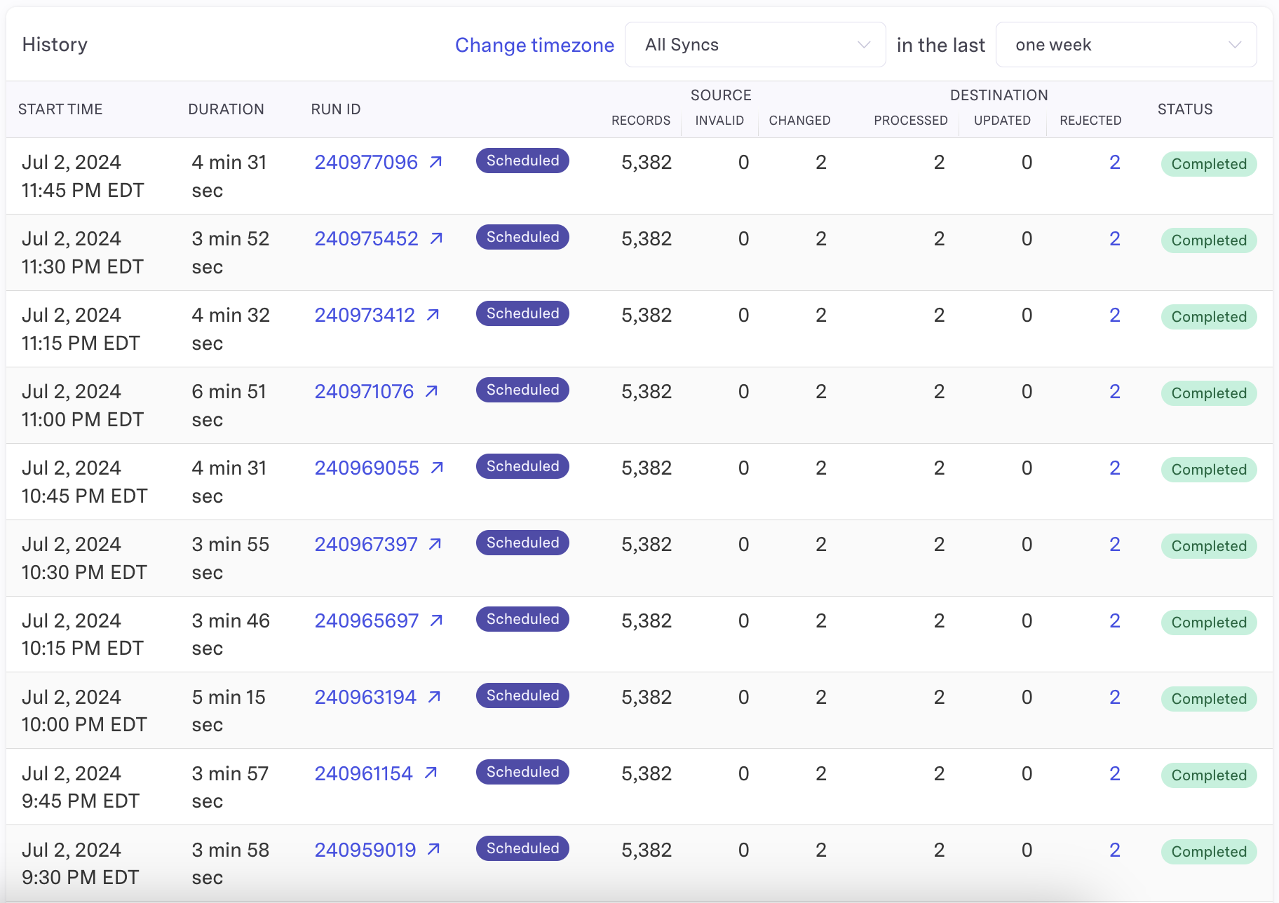 Click on any sync run to see its details, including all of the same information present in the Current Sync Run Overview.