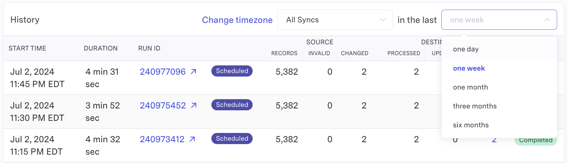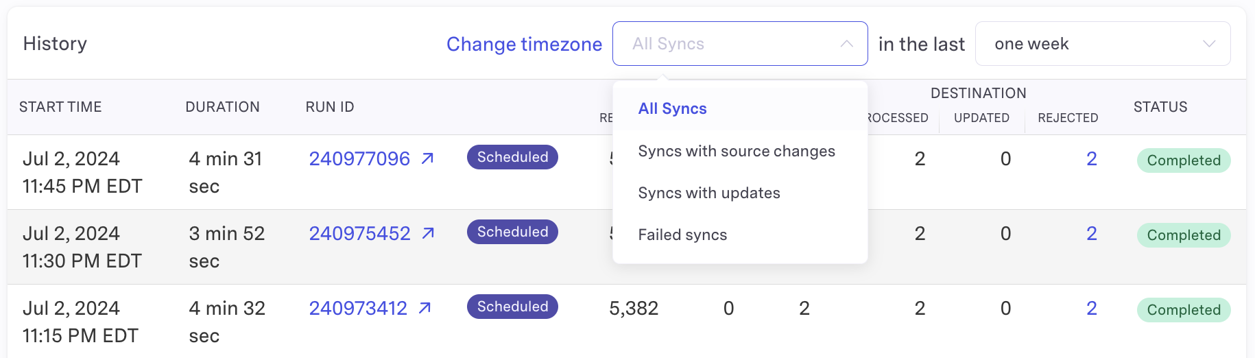 Sync run history can be filtered by both status and how long ago the sync run occurred.
