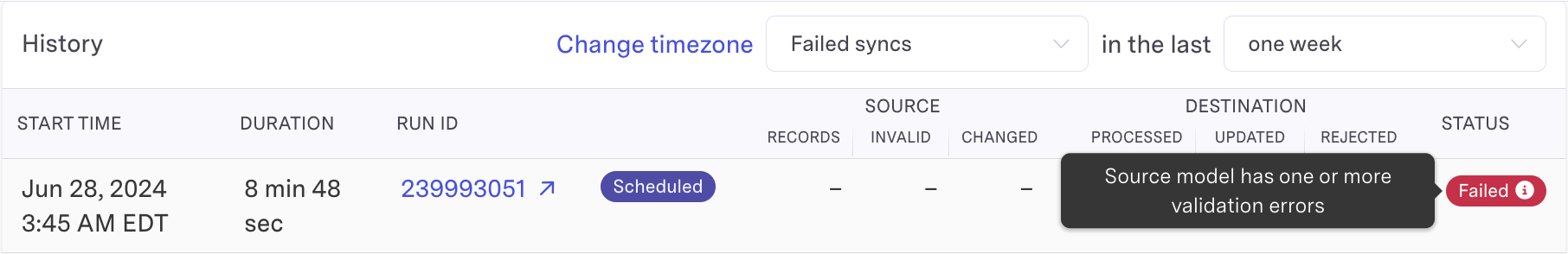 You can dive deeper into why syncs failed, or what records were invalid from the source, or rejected by the destination, under the Sync History tab.