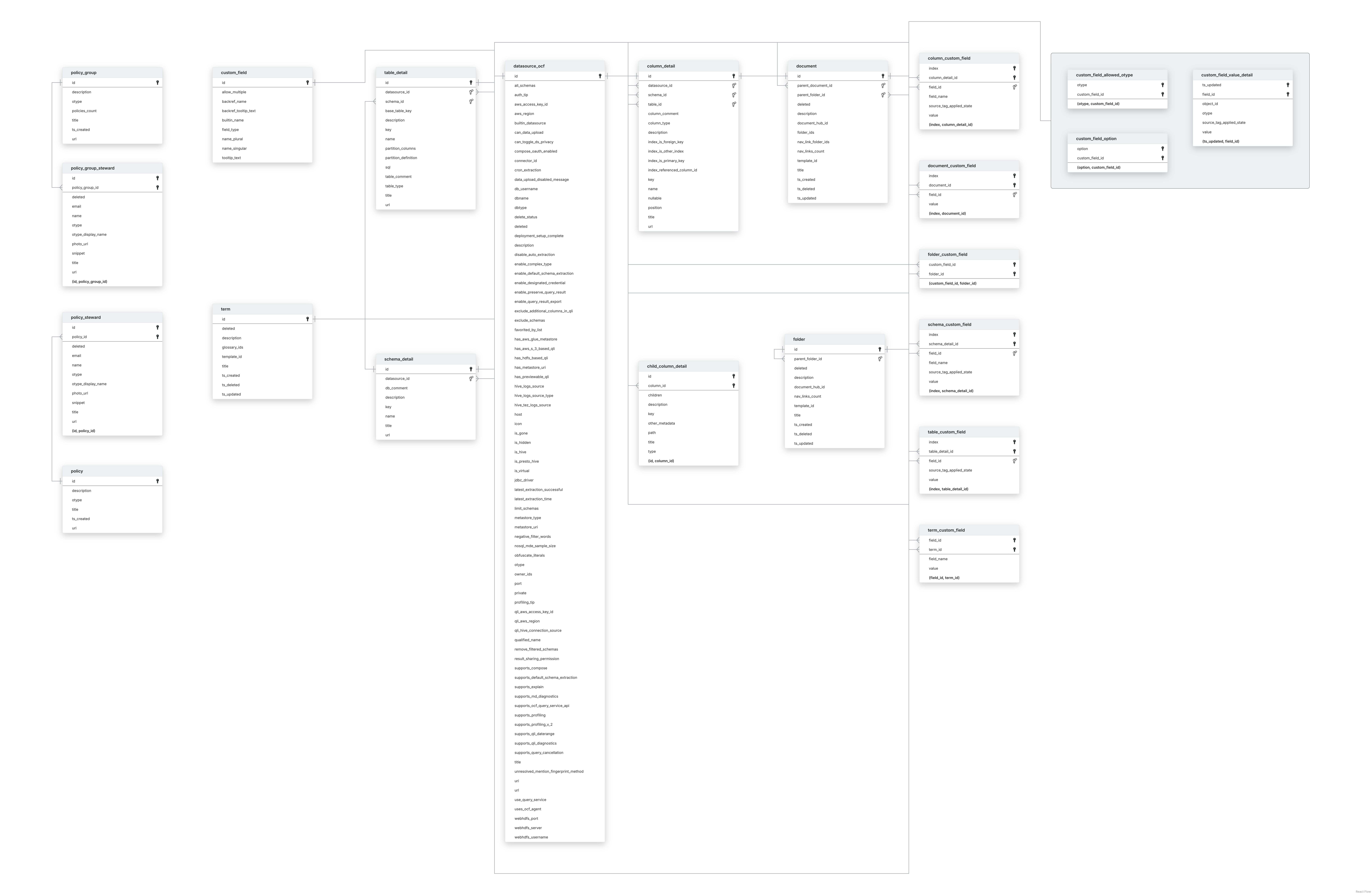 | Custom data | check | COLUMN_DETAIL, DOCUMENT, FOLDER, SCHEMA_DETAIL, TABLE_DETAIL, and TERM tables. |