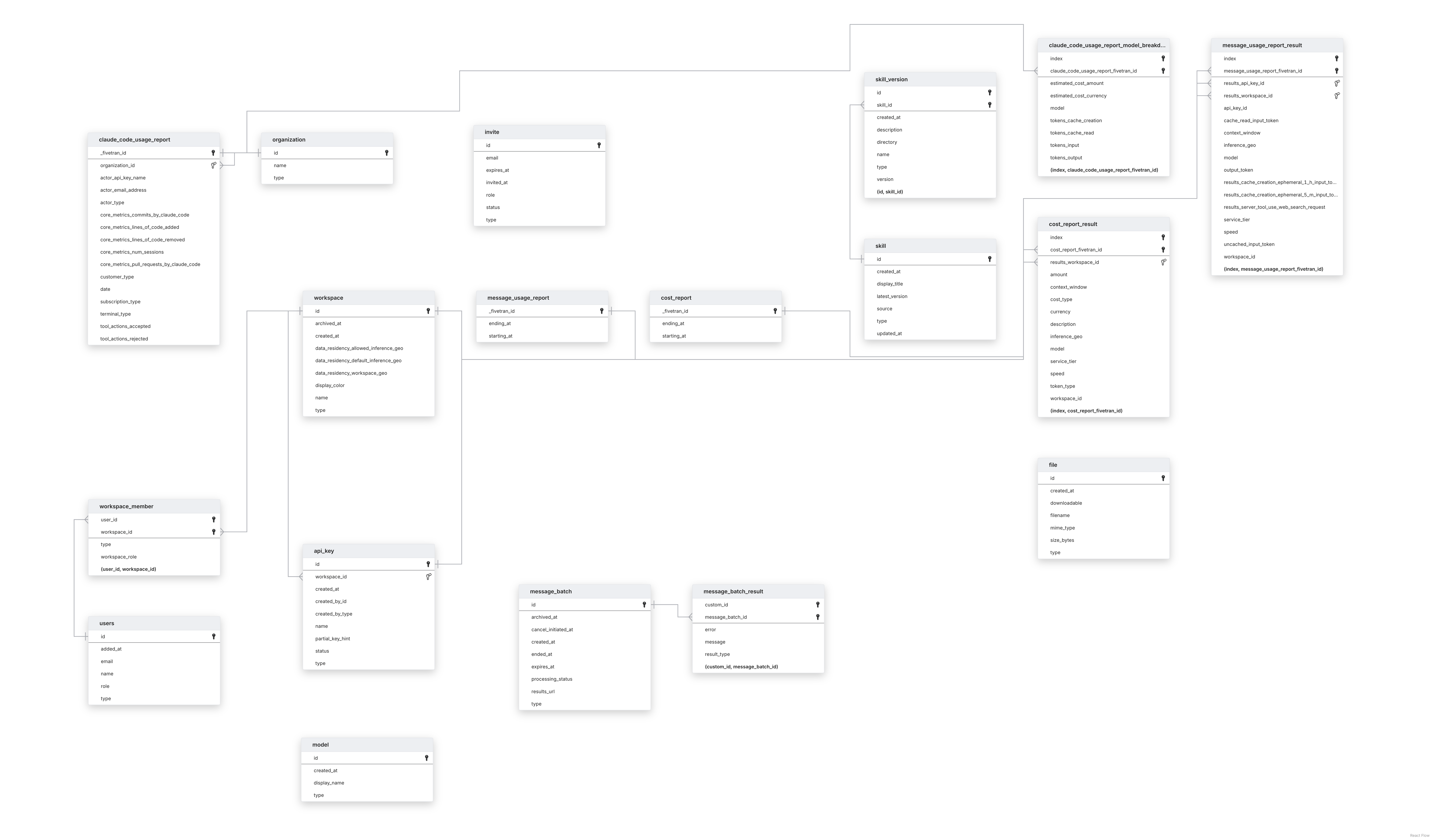 | Capture deletes | MODEL ORGANIZATION USERS WORKSPACE MESSAGE_BATCH MESSAGE_BATCH_RESULT INVITE API_KEY FILE_METADATA SKILL SKILL_VERSION and WORKSPACE_MEMBER tables. | |