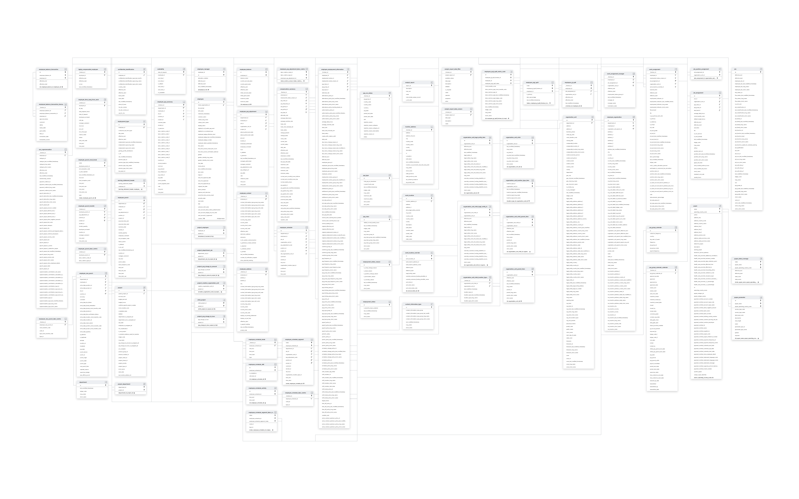AVAILABILITYEMPLOYEE_BALANCE_TRANSACTIONEMPLOYEE_BALANCEEMPLOYEE_MANAGEREMPLOYEE_PAY_ADJUSTMENTEMPLOYEE_PAY_SUMMARYEMPLOYEE_PUNCHEMPLOYEE_RAW_PUNCHEMPLOYEE_SCHEDULEEMPLOYEE_TIME_AWAY_FROM_WORKEMPLOYEEPROJECT