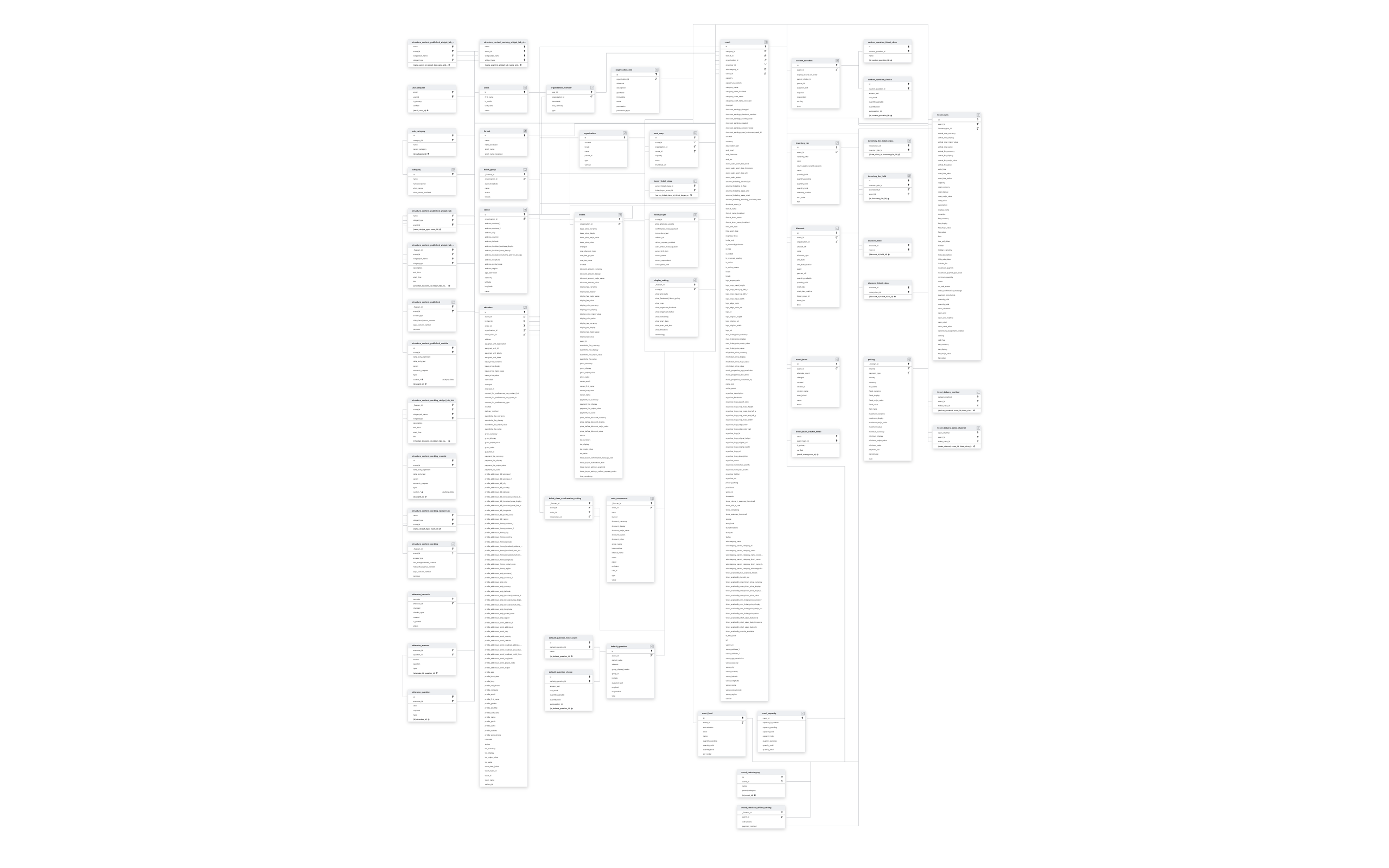 ATTENDEECUSTOM_QUESTIONDEFAULT_QUESTIONDISCOUNTDISPLAY_SETTINGEVENT_CAPACITYEVENT_TEAMEVENTINVENTORY_TIERORDERSSTRUCTURE_CONTENTTICKET_BUYERTICKET_CLASS