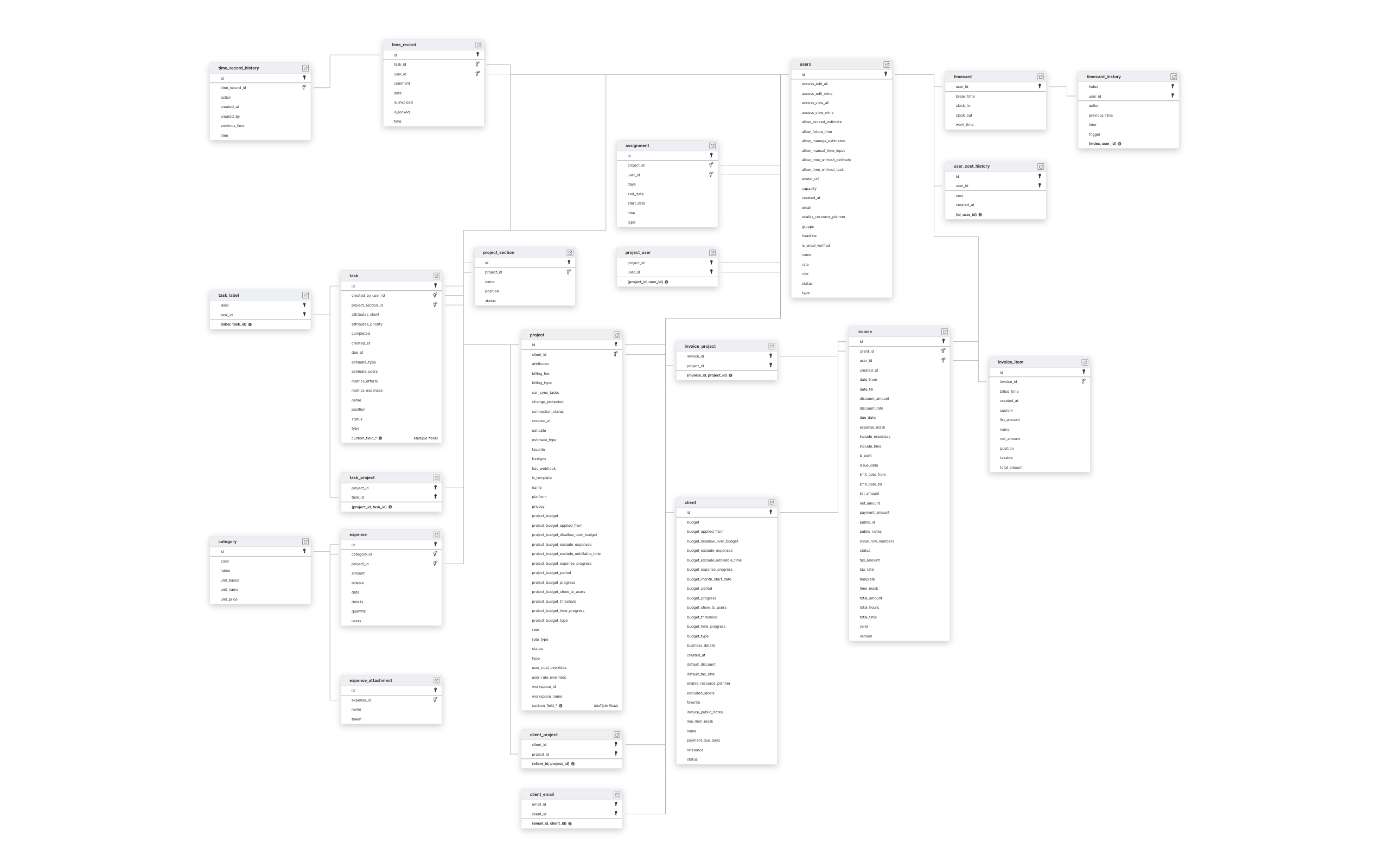 | Capture deletes | check | ASSIGNMENT, CATEGORY, CLIENT, EXPENSE, INVOICE, PROJECT, PROJECT_SECTION, TASK,TEAM_TIMER, TIMECARD, and USERS tables. |