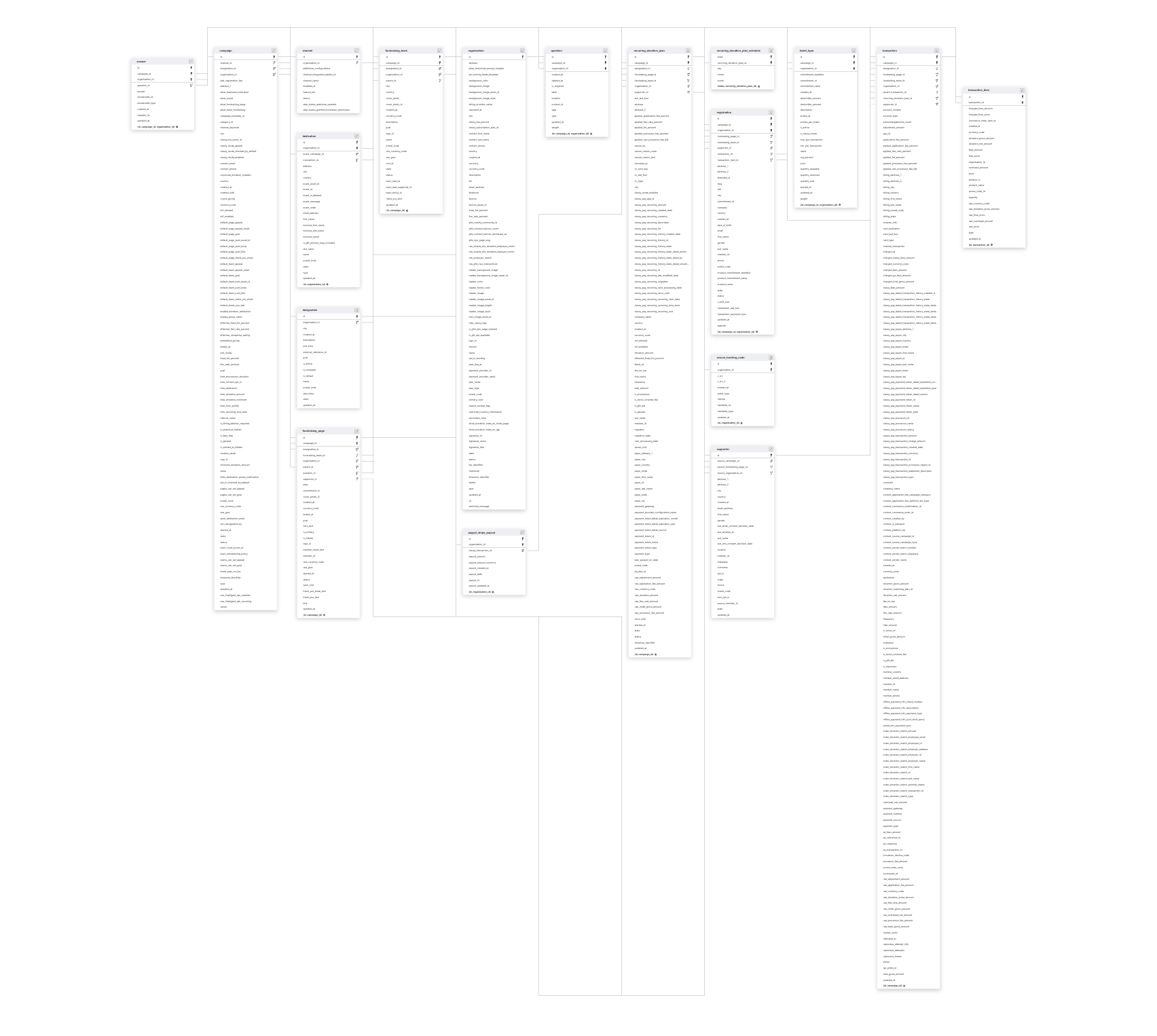 ANSWERCAMPAIGNDEDICATIONDESIGNATIONFUNDRAISING_PAGEFUNDRAISING_TEAMORGANIZATIONQUESTIONRECURRING_DONATION_PLANREGISTRATIONSOURCE_TRACKING_CODESUPPORTERTICKET_TYPETRANSACTION